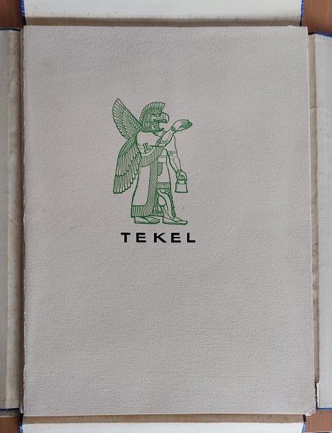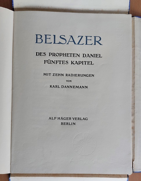DANNEMANN, Karl: Belsazer. Des Propheten Daniel fünftes Kapitel. Berlin (Alf Häger), 1924. Fol. 5 Bl. mit farb. Abb. + 10 einzeln mit Bleistift signierten Radierungen unter Passe Partout in illustrierter OPrgtMappe mit leinenkaschierten Innenflächen in OSchuber Schuber an einer Seite aufgeplatzt, sonst sehr feines Ex. Nr. 6 von 50 Ex. (Gesamtauflage 120). Museal. Bei dieser Vorzugsausgabe wurden der Text auf Tosa Japan und die Radierungen von Carl Sabo auf Kaiserlich Japan gedruckt. Die Bindearbeit sowie die Textabbildungen und die Vergoldung übernahm die Werkstatt Holzhey & Sohn in Leipzig. Karl Dannemann war Meisterschüler von Max Slevogt. In den 1920er Jahren realisierte er in Bremen einige seiner markantesten Werke. Er schuf die Fresken im Bacchuskeller des Bremer Ratskellers, das Gemälde Hindenburg-Bankett im Bremer Rathaus, sowie diverse Bühnenbilder, Porträts, Seestücke, Stillleben, Stadt- und Landschaftsbilder. In den 1930er und 1940er Jahren betätigte sich Dannemann als Schauspieler beim Film, wo er in insgesamt über 50 Produktionen mitwirkte, in Unterhaltungsfilmen gleichermaßen wie in nationalsozialistischen Propagandafilmen. Vom Kriegseinsatz war er als unabkömmlich befreit worden und stand auf der Gottbegnadeten-Liste. Dannemann schied 1945 im Alter von 49 Jahren freiwillig aus dem Leben, um sich der Gefangennahme durch sowjetische Truppen zu entziehen. (Wikipedia)