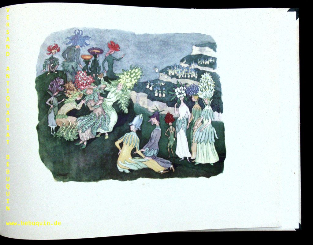 KREIDOLF.– KREIDOLF, Ernst: Alpenblumenmärchen. Erlenbach-Zürich (Rotapfel), (1933). Quer 4°. 21 Bl. mit 17 farb. Bildtafeln. farb. ill. OHLn. Vorderdeckel mit kleinem Fleck am Rand, kaum gelockert, schönes Ex. Ausgabe der kleinen Ausgabe mit bisher nicht beschriebenen 4 Seiten Verlagswerbung. Klotz 3698/1.