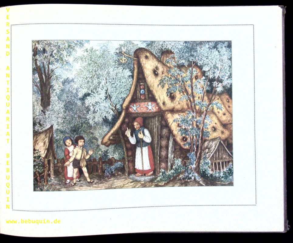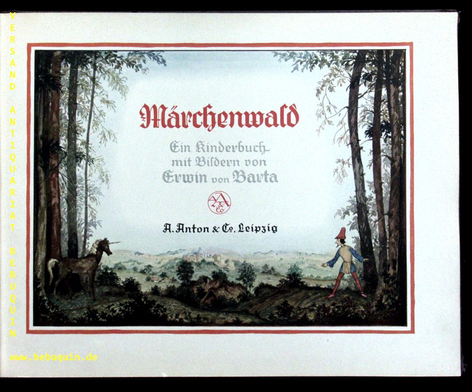 BARTA.– MÄRCHENWALD.– Ein Kinderbuch nach Texten der Gebrüder Grimm und Ludwig Bechstein. Leipzig (Anton), (1920). Quer 4°. 36 S. mit farbigem Titel und 8 ganzseitigen Farbbildern von Erwin von Barta. farb. ill. OHLn. Deckel mit leichten Kratzspuren, sonst von sehr feiner Erhaltung. = Verlagsnummer 815. Sehr seltene EA hier mit einem von Kohlweyer 3 / 1051 abweichenden Einbandbild.