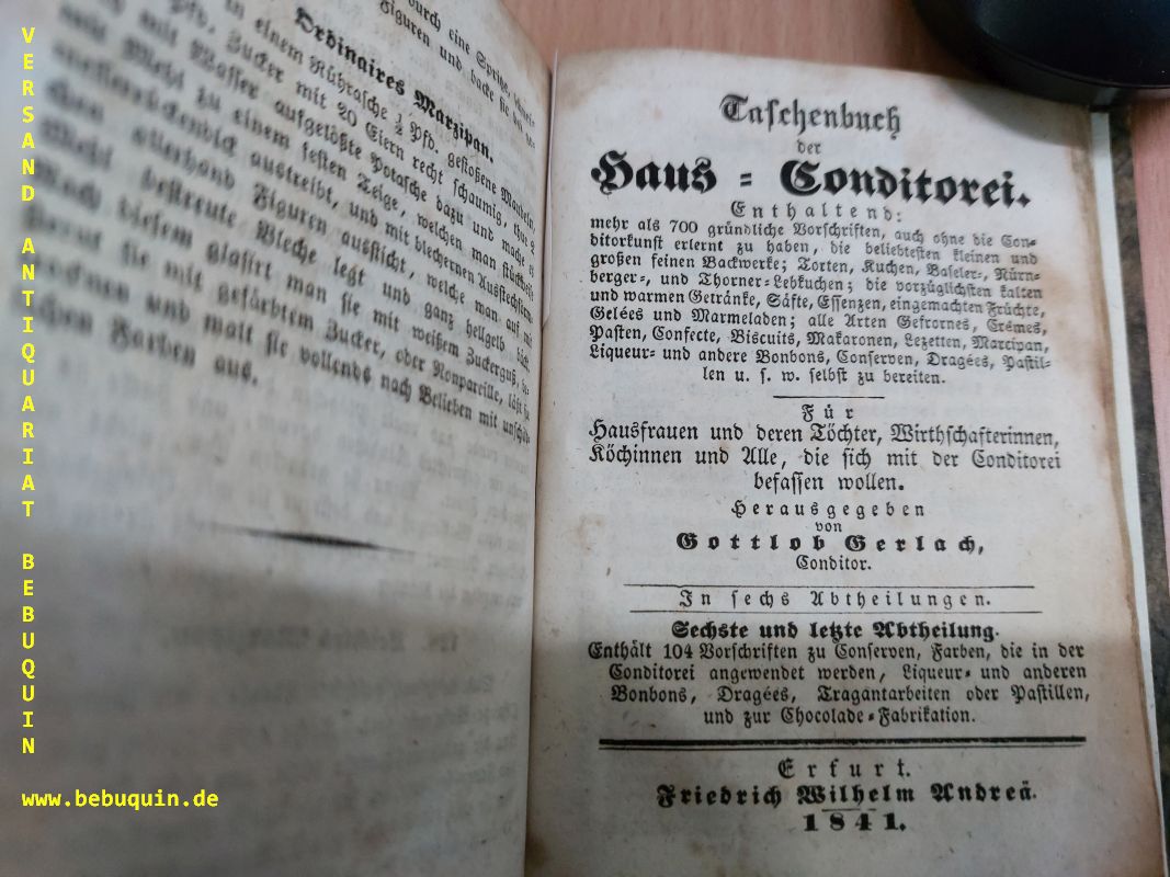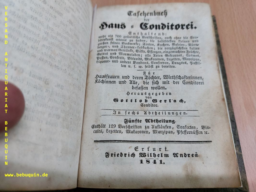KOCHBÜCHER.– GERLACH, Gottlob: Taschenbuch der Haus-Conditorei. Für Hausfrauen und deren Töchter, Wirthschafterinnen, Köchinnen und alle, die sich mit der Conditorei befassen wollen. In 6 Abtheilungen. Erfurt (Andrea), 1841. 12°. 40, 57, 54, 47, 48, 48 S. mit 729 gründlichen Vorschriften für (…) Torten, Kuchen, Baseter-, Nürnberger- und Thorner Lebkuchen, Gelees und Marmeladen, Gefrorenes, Cremes, Pasten, Confecte, Biscuits, Makaronen, Lezetten, Marcipan, Dragees usw selbst zu bereiten. neuer Pb mit goldgeprägtem Rücken. innen teils stärker braunfleckig, Titelseite der ersten Abtheilung fehlt. Rarissimum der EA dieses Konditoreibuches. Wohl kein zweites Mal aufzufinden.