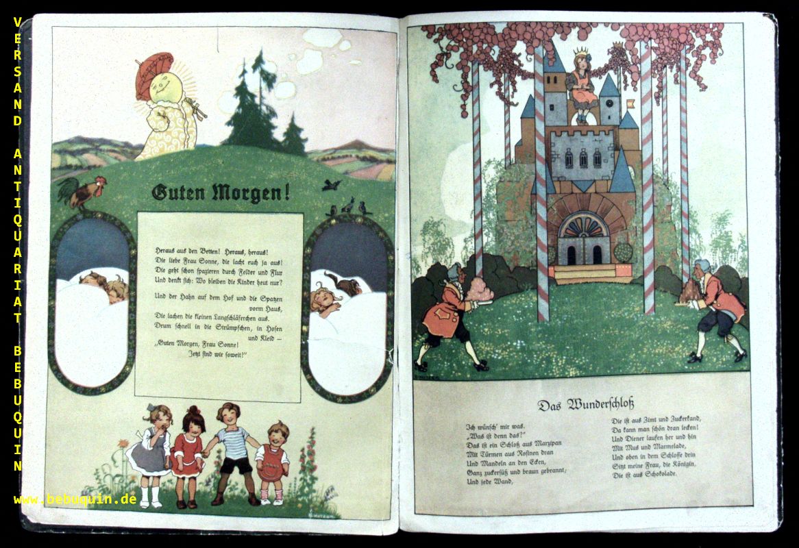 KUTZER.– HOLST, Adolf: Tandaradei. Neue Kinderlieder. 5. Aufl. Oldenburg (Stalling), (1924). Gr. 4°. 8 Bl. mit ebensovielen nahezu ganzseitigen farb. ill. von Ernst Kutzer. farb. ill. OHLn. Ec ken leicht bestoßen, Heftung kaum gelöst, insgesamt gutes Ex. des anspruchsvollen und empfindlichen Titels. Blaume 070, Klotz 2869/165.