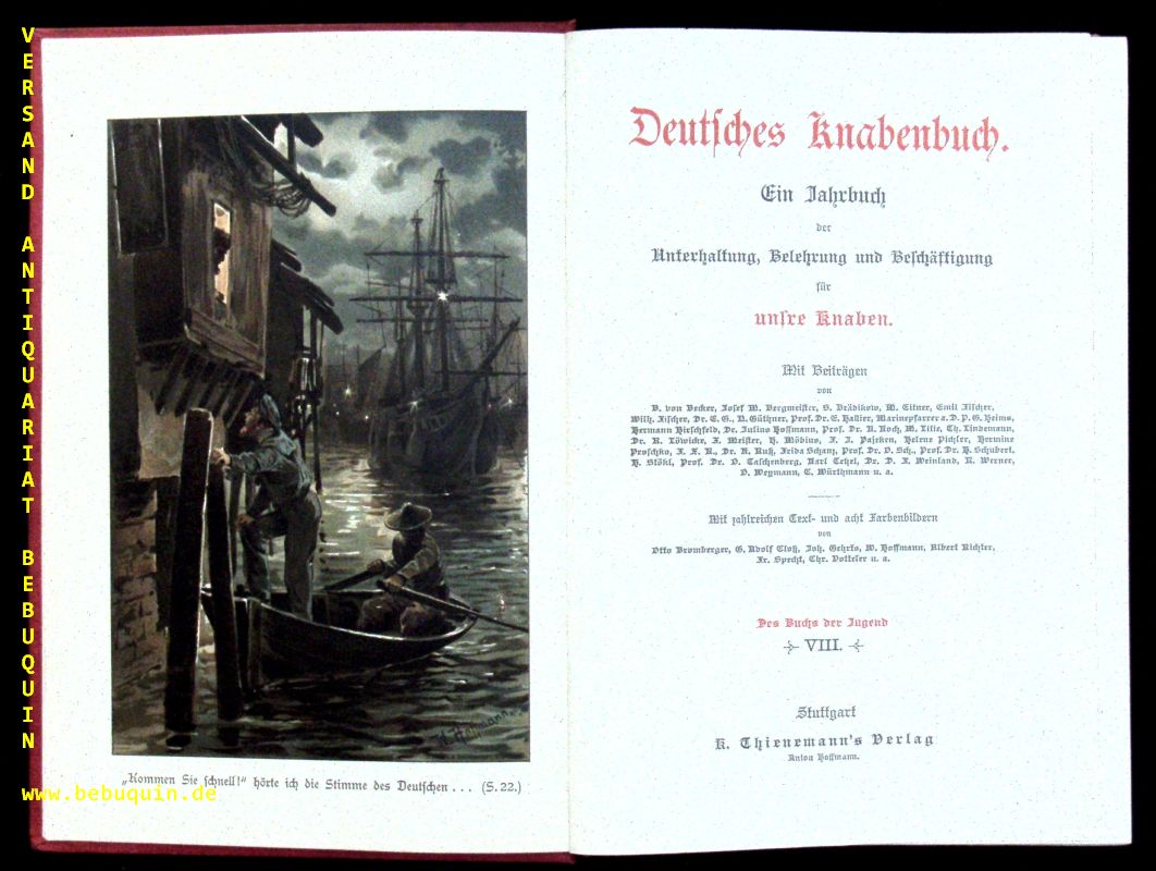 DEUTSCHES KNABENBUCH.– Bd. 08. Ein Jahrbuch der Unterhaltung, Belehrung und Beschäftigung für unsere Knaben. Stuttgart (Thienemann), (1896). Gr. 8°. 400 S. mit zahlr. Text- und 8 Farbenbildern von Bromberger, Joh. Gehrts, Fr. Specht, Chr. Votteler u.a. farb. ill. OLn. Rückdeckel leicht angeschmutzt, NaV, sonst gut erhalten. Mit Texten von Hallier, Heims, Hirschfeld, Möbius, Meister, Löwicke, Proschko, Pajeken, Weymann, Meister, Würthmann u.a.