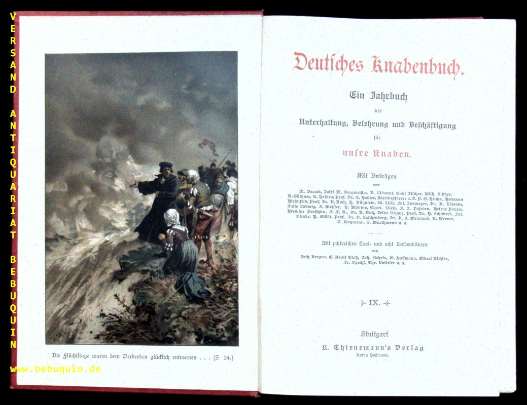 DEUTSCHES KNABENBUCH.– Bd. 09. Ein Jahrbuch der Unterhaltung, Belehrung und Beschäftigung für unsere Knaben. Stuttgart (Thienemann), (1897). Gr. 8°. 400 S., mit zahlr. Text- und 8 Farbenbildern von Fritz Bergen, Joh. Gehrts, Fr. Specht, Chr. Votteler u.a. farb. ill. OLn. Rücken geblichen, eine Tafel lose, sonst gut erhalten. Mit Texten von Barack, Bergmeister, Clement, Lohmeyer, Löwicke, Meister, Möbius, Schanz, Stökl, Wegmann u.a.