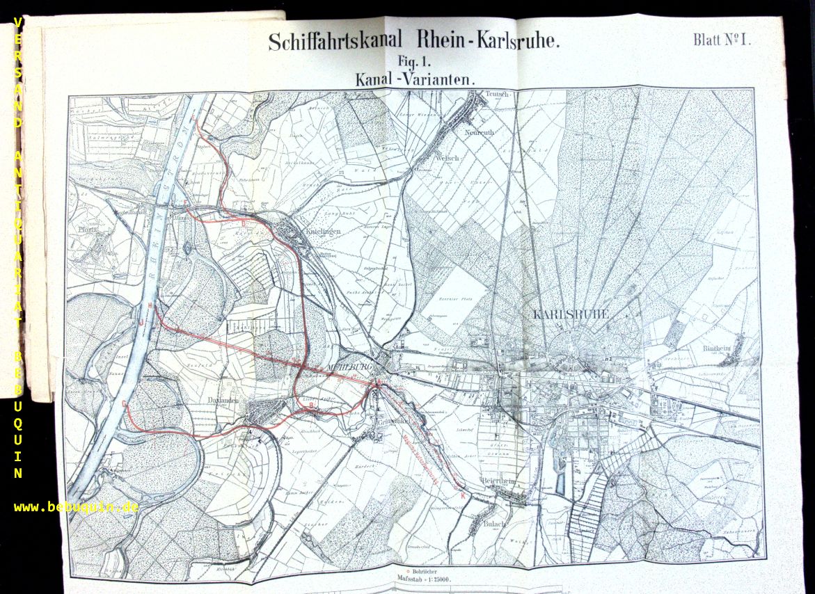 KARLSRUHE.– SCHÜCK, Hermann: Karlsruhe, ein Rhein-Hafenplatz. Projekt einer Schiffahrtverbindung der Residenz mit dem Rhein. Nebst Entwürfen für ein maschinelles Schiffshebewerk von C. Hoppe (Maschinenfabrik in Berlin), Gutehoffnungshütte (Aktienverein für Bergbau und Hüttenbetrieb in Oberhausen), F. Krupp, Grusonwerk (in Magdeburg). Karlsruhe (Machlot), 1893. 4°. 101 S. + 11 gefaltete Planbeilagen. Okart. Rücken mit Klebestreifen fixiert, Block etwas gelockert, Einband bestaubt, die letzten Seiten an einer Ecke mit kleinem Tintenrand, insgesamt von guter Erhaltung. sehr seltene EA. Hermann Schück (* 16. März 1848 in Heidelberg, † 9. März 1911 in Karlsruhe) war ein Karlsruher Stadtbaumeister.