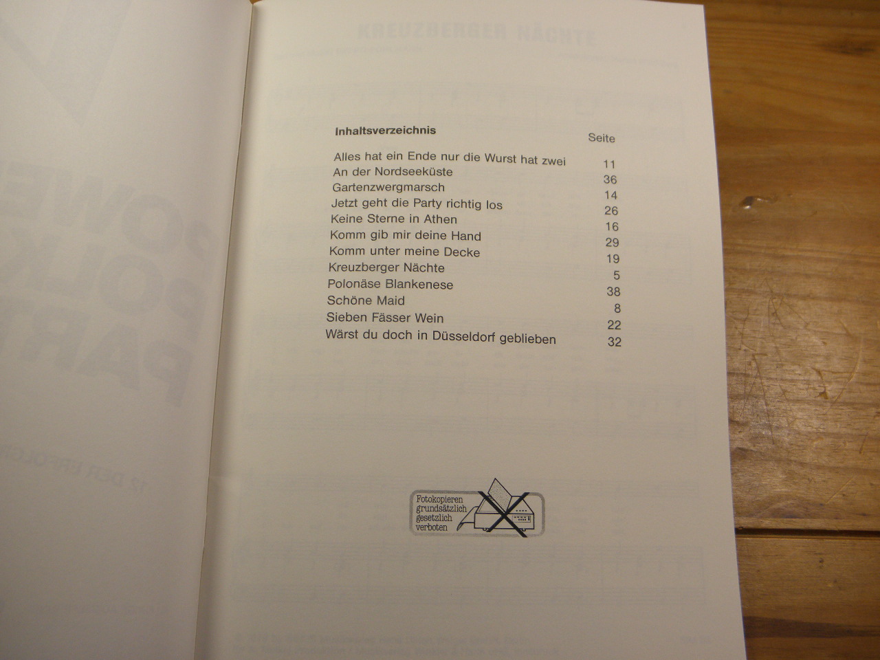 SONGBOOKS.– POWER POLKA PARTYHITS.– 12 der erfiolgreichsten Stimmungshits. Gesang und Klavier. Berlin (Intro), 1978. 4°. 40 S. mit Noten. ill. OKart. gutes Ex. EA. Inhalt siehe Foto.