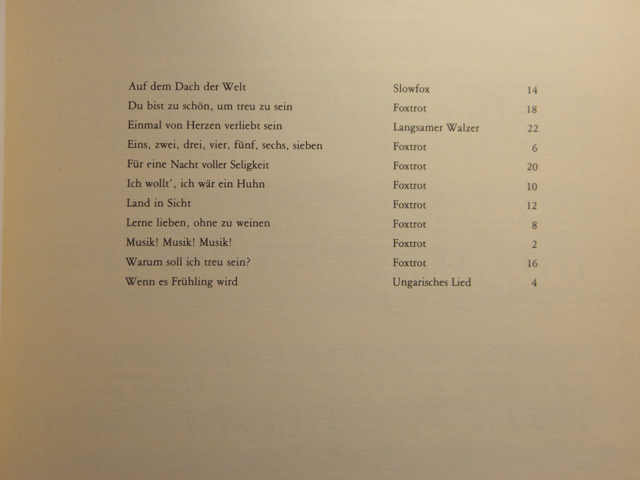 SONGBOOKS.– KREUDER, Peter: Musi, Musik, Musik. 11 Tonfilm-Melodien. Klavier und Gesang. Berlin (Ufaton), o.J. 4°. 24 S. mit Noten. ill. OKart. gutes Ex. EA. Inhalt siehe Foto.