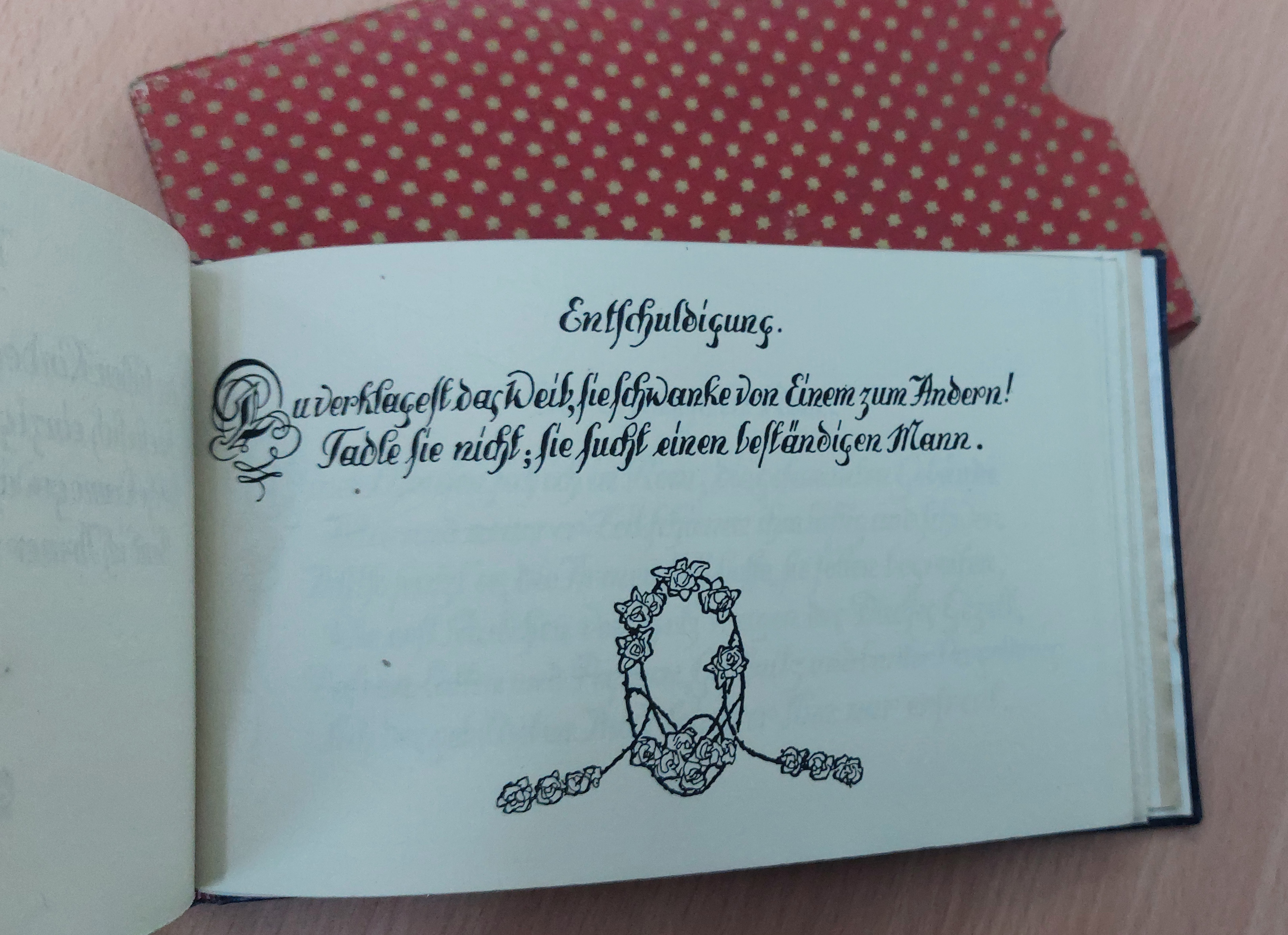 JANKOWSKI.– GOETHE, Johann Wolfgang: Antike Gedichte. München (Recht), 1921. Quer-Klein-8°. 31 Blatt. Die antiken Gedichte Goethes schrieb der Radierer Fritz Janowski, Charlottenburg. Jedes Gedicht mit einer Textvignette sowie eine signierte Original-Radierung von Fritz Janowski auf der ersten Seite. Signierter Einband (Stempel der Daphnis-Binderei, O. Herfurth auf hinterem Innendeckel). Blauer Original-Halblederband mit goldgeprägtem Rückentitel und ornamentalem Buchschmuck in Schmuckschuber. sehr feines Ex. Nummer 72 von 100 nummerierten Exemplaren einer einmaligen Auflage auf Van Gelder-Bütten. Rodenberg 325.