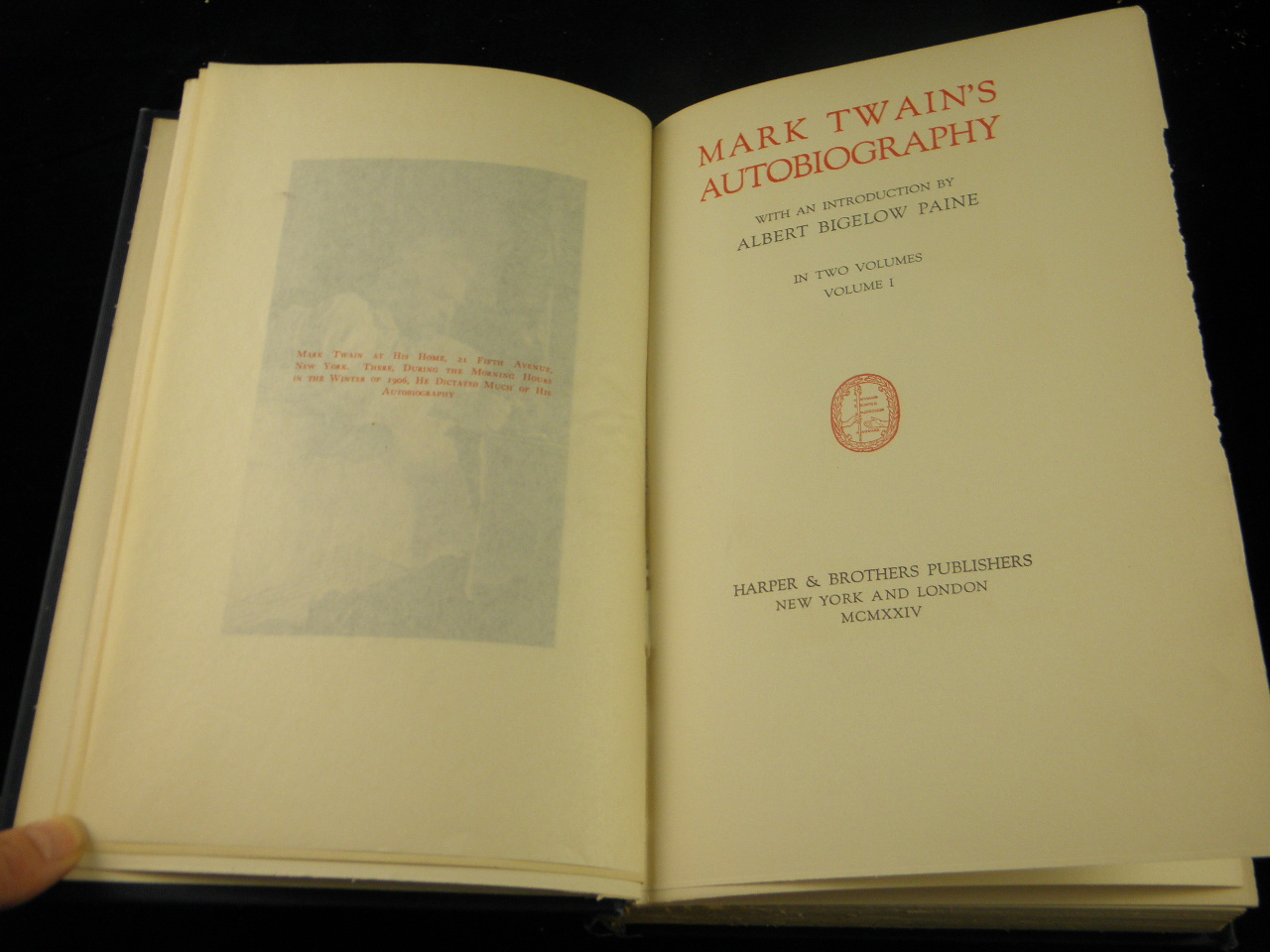 TWAIN, Mark: Autobiography. With an introduction by Albert Bigelow Paine. 2 Bände. New York & London (Harper), 1924. Gr. 8°. XVI, 368, 365 (2) S. mit 1 Faksimile und 2 Portraittafeln als Frontispiz. OLn. Gelenke von Bd. 2 aufgeplatzt, sonst gut erhalten. EA.