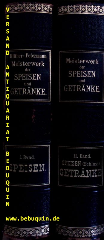 KOCHBÜCHER BLÜHER, Paul Martin: (Hrsg.) Meisterwerk der Speisen und Getränke. Französisch, deutsch, englisch (und andere Sprachen) = Encyclopédie de cuisine de tous les pays = International encyclopaedia of food and drink. 2., wesentlich verb. Stereotyp-Aufl. 2 Bände. Leipzig (Blüher), 1898. Gr. 8°. VIII, 2014 (2) S. mit zahlr. Bildtafeln und Faltkarten. OHLdr mit goldgeprägtem Rücken. Kanten leicht berieben, sonst gut erhalten.