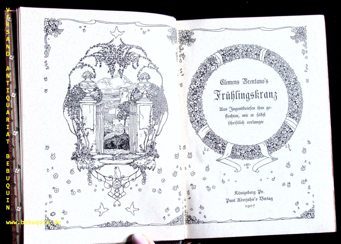 VOGELER-WORPSWEDE.– BRENTANO, Clemens: Frühlingskranz. Aus Jugendbriefen ihm geflochten, wie er selbst schriftlich verlangte. Königsberg (Aderjahn), 1907. XVI, 379 S. mit Buchschmuck von Heinrich Vogeler-Worpswede. Grünes Orig.-Maroquin mit Rückenverzierung und Deckelmedaillon sowie mit bunten Vorsätzen von Vogeler sowie Kopfgoldschnitt. Rücken und Einbandränder geblichen, Goldprägung jedoch deutlich sichtbar. schönes Ex. der Luxus-Ausgabe. Hrsg. von Hugo Königsdorf. Satz und Druck in der urspr. Type der Erstausgabe vom 1844. Mallon 134.