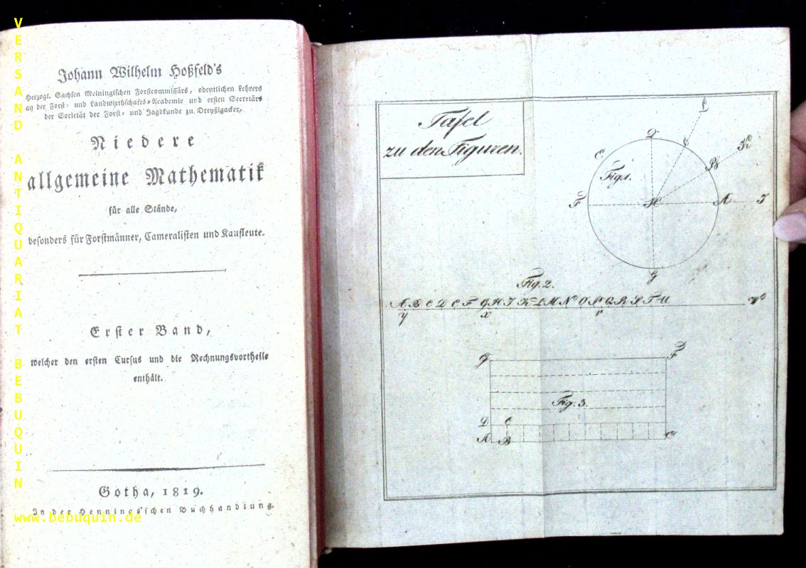 JAGD.– HOSSFELD, Johann Wilhelm: Erster Cursus und die Rechnungsvortheile. Niedere allgemeine Mathematik für alle Stände, besonders für Forstmänner, Cameralisten und Kaufleute. 1. Bd. Gotha/Erfurt, (Hennings), 1819. XII, 655 S. + 1 gefaltete Bildtafel mit dreiseitigem Rotschnitt. HLdr der Zeit mit goldgeprägtem Rücken. Kanten teils stärker berieben,Rücken mit Tesa fixiert, innen gut. = Die Forst- und Jagdwissenschaft nach allen ihren Theilen für angehende und ausübende Forstmänner und Jäger, 2. Theil. EA. Johann Wilhelm Hoßfeld oder Hossfeld (* 19. August 1768 in Oepfershausen; † 23. Mai 1837 in Dreißigacker) war ein deutscher Forstmathematiker. Er war ein Pionier der Mathematik im Bereich der Forstwissenschaft. (Wikipedia)
