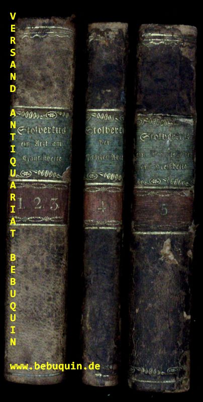 MEDIZIN.– MAI, Franz Anton: Stolpertus, ein junger Arzt am Krankenbette. Von einem patriotischen Pfälzer. Neue Auflage. 5 Teile (alles Erschienene) in 3 Bänden. Mannheim (Schwan und Götz), 1800-1807. kl. 8°. Zus. über 1000 S. mit 5 gestochenen Titelvignetten. Hldr der Zeit mit goldgeprägten Rückenschildern. Kanten etwas berieben, innen sehr gut erhalten. Der 4. Band = Stolpertus der Polizei-Arzt. 5. Bd. = Stolpertus ein junger Geburtshelfer am Kreißbette. Franz Anton Mai (* 16. Dezember 1742 in Heidelberg; † 20. April 1814 ebenda), war ein deutscher Arzt, Medizinalrat, Professor der Arzneiwissenschaft, Medizin und Geburtshilfe, sowie Rektor der Universität Heidelberg, Sozialreformer und Pionier der Arbeitsmedizin.