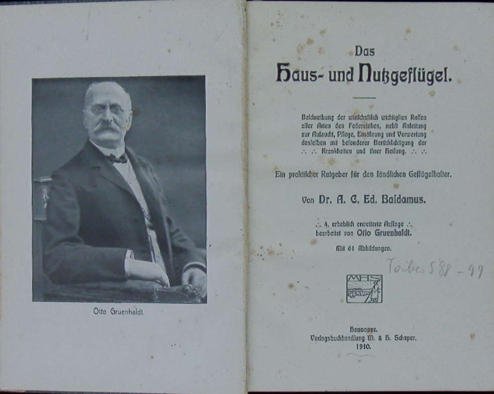ORNITHOLOGIE.– BALDAMUS, A.C.Ed.: Das Haus- und Nutzggeflügel. Beschreibung der wirtschaftlich wichtigsten Rassen aller Arten des Federviehes nebst Anleitung zur Aufzucht, Pflege, Ernährung und Verwertung desselben. (…) Ein praktischer Rathgeber für ländliche Geflügelhalter. 4. erheblich erweiterte Aufl. bearb. von Otto Gruenhaldt. hannover (Schaper), 1910. VIII, 219 (5) S. mit 61 Abb. ill. OLn. vereinzelz etwas stockfleckig, sonst gutes Ex.