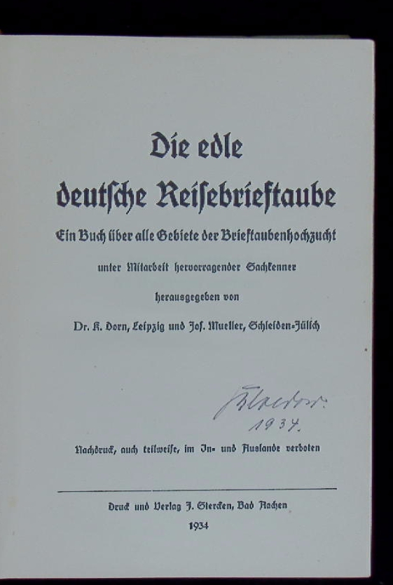 TAUBEN.– DORN, K. + MUELLER, Jos.: Die edle deutsche Reisebrieftaube. Ein Buch über alle Gebiete der Brieftaubenhochzucht. Unter Mitarbeit hervorragender Sachkenner hrsg. Bad Aachen (Stercken), 1934. 335 S. + sehr vielen Bildtafeln. OLn. Einband geblichen. EA.