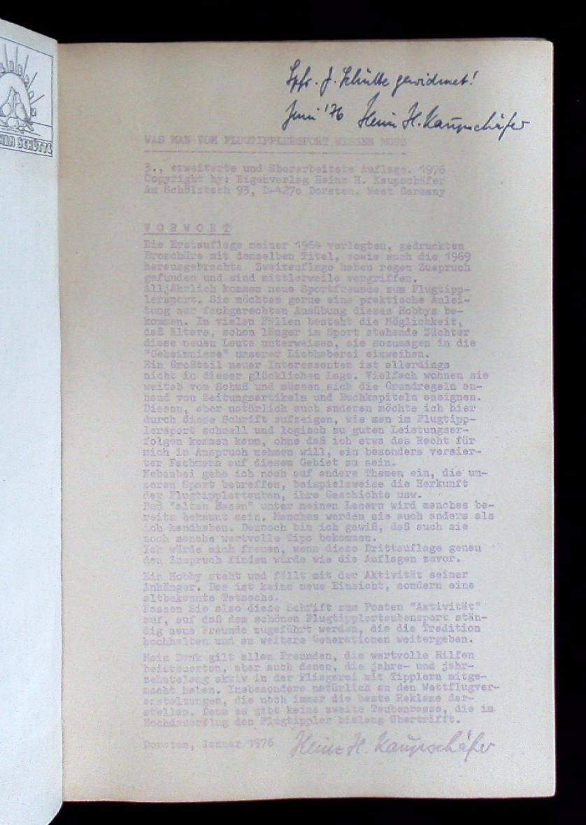 TAUBEN.– KAUPSCHÄFER, Heinz H.: Was man vom Flugtipplersport wissen muss. 3. erweiterte und überarbeitete Aufl. Dorsten, 1976. 4°. 48 Bl. + 12 Bildtafeln. ill. OKart. sehr seltene letzte Auflage mit einer eigenhändigen persönlichen datierten und voll signierten Widmung des Verfassers auf der ersten Seite.
