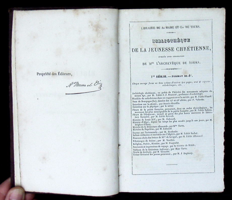 IRVING, Washington: Conquête de Grenade. Übersetzt vobn Adrien Lemercier. Troisieme Édition. Tours (Mame), 1842. kl. 8°. 312 S. mit 4 Stahlstichtafeln. OLdr mit reicher Gold- und Blindprägung. Rücken gebräunt. = Bibliotheèque de la jeunesse chrétienne.