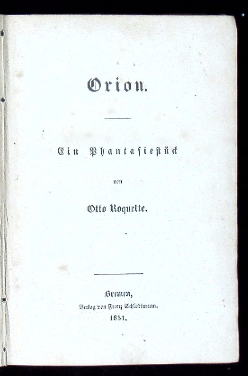 ROQUETTE, Otto: Orion. Ein Phantasiestück. Bremen (Franz Schlodtmann), 1851. kl. 8°. 364 S. HLn der Zeit mit goldgeprägtem Rücken. leicht schief gelesen, vereinzelt braunfleckig. EA der 2. Veröffentlichung. WG² 2.