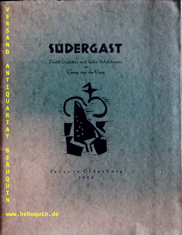 VRING, Georg von der: Südergast. 12 Gedichte und 6 Holzschnitte. Jever, 1925. 4°. 14 Bl. mit 6 Holzschnitten des Künstlers. OKart. mit OHolzschnitt. Einband lichtrandig. = 1. Sonderdruck der EOS-Presse Piesteritz. EA des Erstlingswerks mit spätexpressionistischen Gedichten. WG² 1.