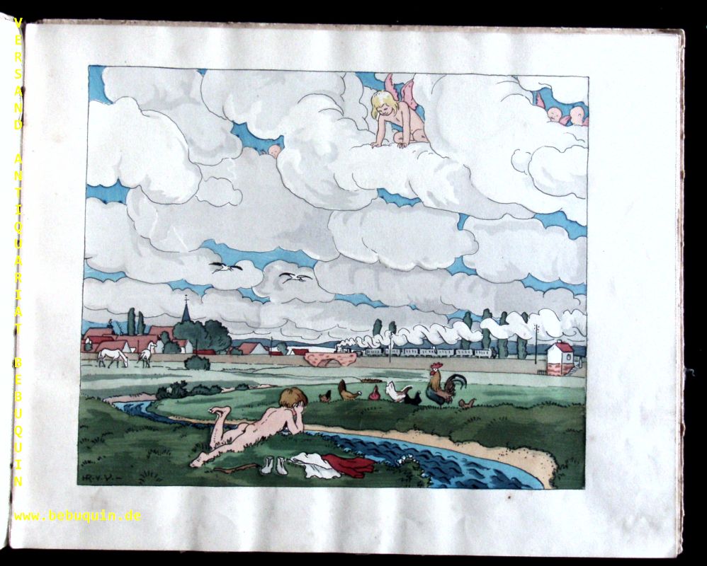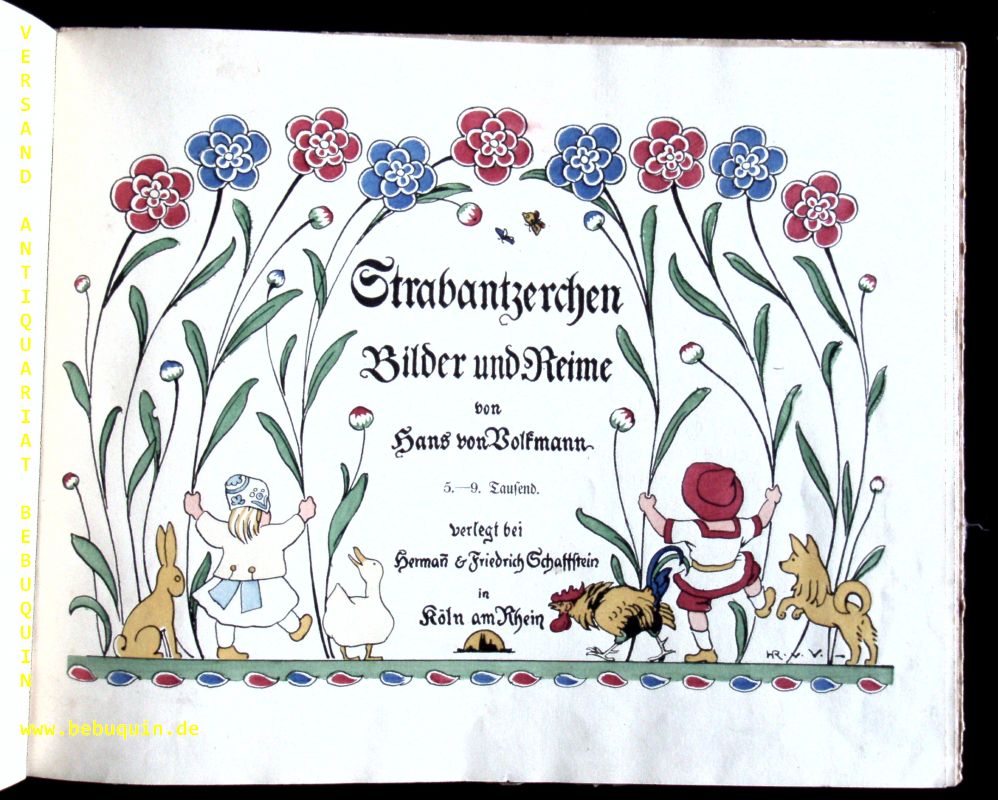 VOLKMANN, Hans von: Strabantzerchen. Bilder und Reime. 5.– 9. Tsd. Köln (Schaffstein), 1906. Quer Gr. 4°. 18 S. mit farb. illustr. Titelblatt u. 16 blattgrosse Illustrationen mit Pochoirkolorit von H. R. Volkmann sowie den Hähnchenvorsatzpapieren. farb. ill. OPb. Einband angeschmutzt, Gelenke etwas gelockert, die Tafeln nur vereinzelt fingerspurig, insgesamt gut. Doderer III, 723. – Ries 949. – Schug 515. – „Es handelt sich um den wohl vollkommensten Einsatz von Pochoir-Kolorit im deutschen Kinderbuch“ (Schug). Der Landschaftmaler, Graphiker und Exlibriszeichner Hans Richard von Volkmann (1860-1927) studierte in Düsseldorf bei Crola, Lauenstein und Peter Janssen, war Meisterschüler bei Schönlebens in Karlsruhe, wo er ab 1892 bis zu seinem Lebensende freischaffender Künstler war.