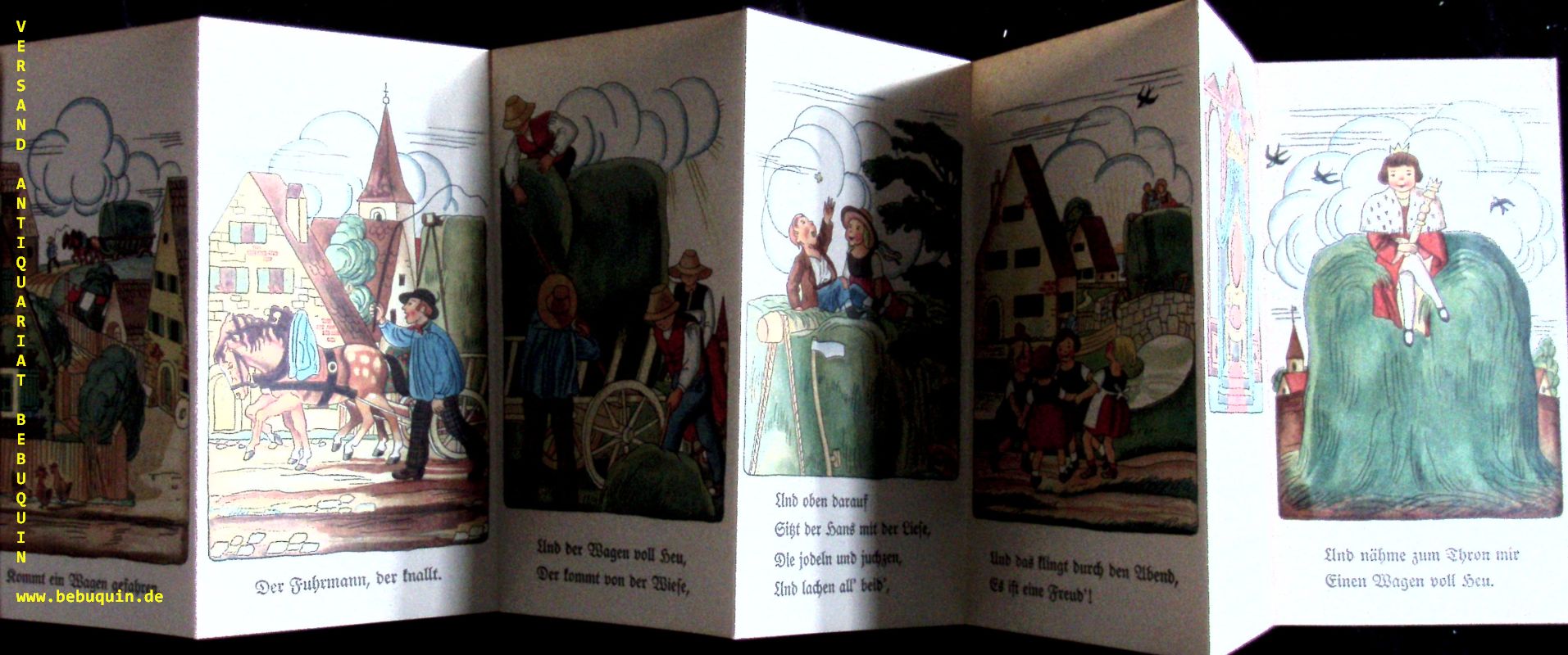 REINICK, Robert: Das Dorf. Nürnberg (Stalling), 1926. kl. 8°. 12tlg. Leporello mit 12 farb. Bildern von Gottfried Eisenhut mit unterlegtem Text. farb. ill. OPb. Kanten leicht berieben, sonst gute Erhaltung. = Nürnberger Bilderbücher Nr.52. Seltene EA. Liebert 52.