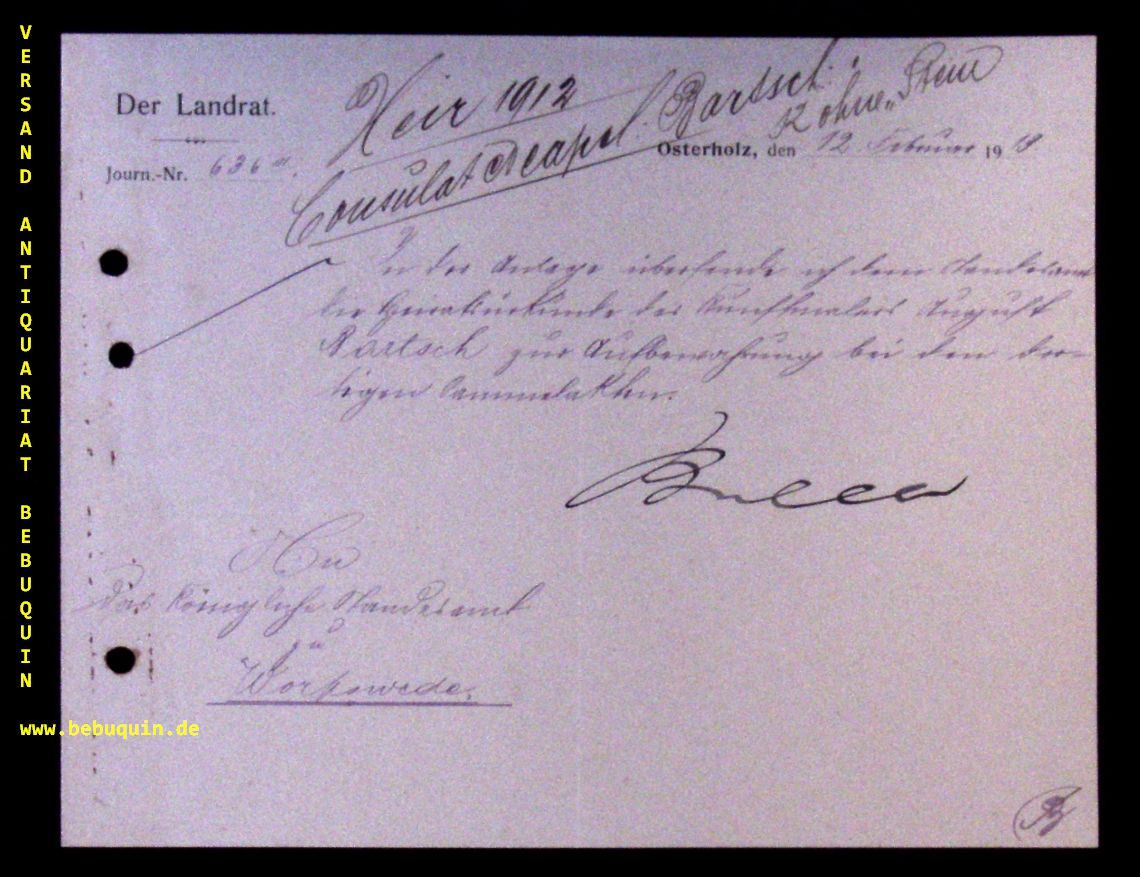 WORPSWEDE.– BARTSCH, Wilhelm: Heiratsurkunde des Kunstmalers Gustav Wilhelm August Bartsch mit Maria Alma Kühne-Stein in beglaubigter Abschrift. August Bartsch, wohnhaft in Worpswede, zur Zeit aufhältlich in Capri, rechtskräftig geschiedener Ehemann von Else geborene Nölle und Alma Kühne-Stein, gebürtig aus Leisnig, Tochter des im unbekannten Ort verstorbenen Hutmachers Johan Heinrich Stein und dessen ebenfalls verstorbenen Ehefrau an Kindesstatt angenommen von der in Bremen wohnhaften unverehelichten Anna Mathilde Kühne. Verhandelt am 19.3.1912. Neapel, 27.12.1912. Gr. 4°. Doppelblatt. seitlich gelocht. Dabei das offizielle Begleitschreiben des Landrats Osterholz an das Standesamt in Worpswede vom 12. Februar 1913. Wilhelm Bartsch (* 3. März 1871 in Kiel; † 30. Juni 1953 in Hannover) war ein deutscher Landschafts- und Marinemaler der Düsseldorfer Schule. Nach 1909 wurde er Teil der zweiten Generation der Künstlerkolonie Worpswede. (Wikipedia)