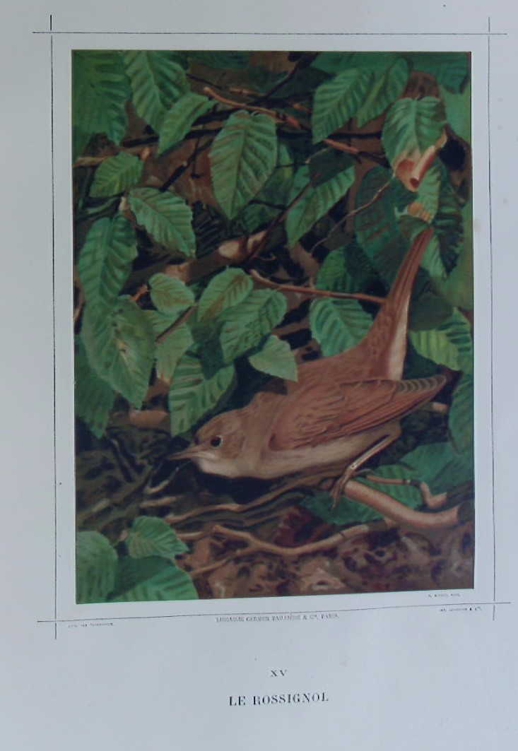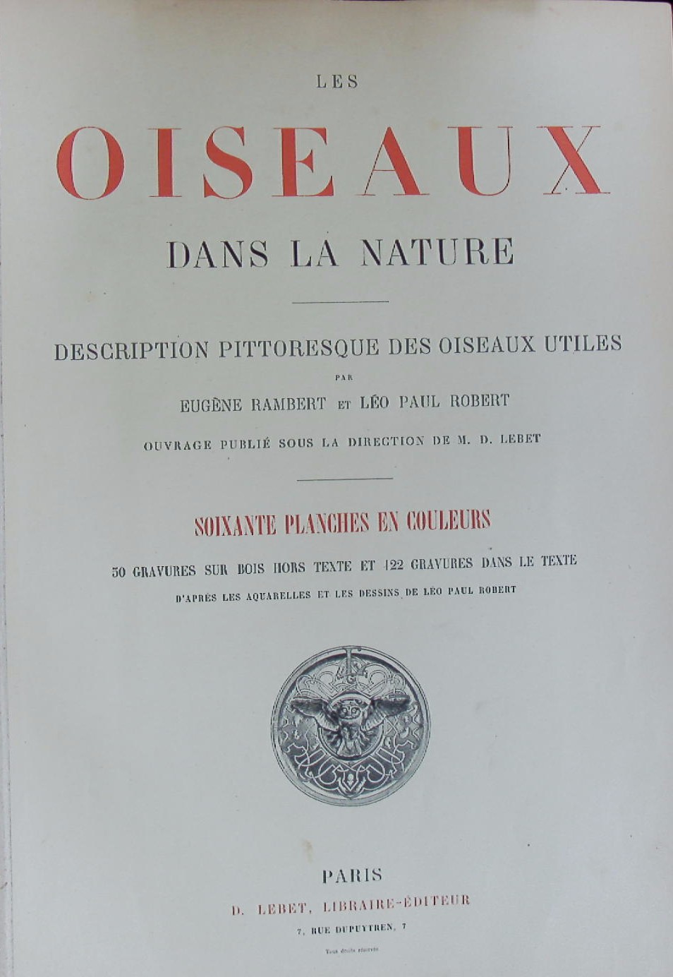 ORNITHOLOGIE.– RAMBERT, Eugene: Les oiseaux dans la nature. Description pittoresque des oiseaux utiles. Paris (Lebet), 1878. Fol. 63, 60, 50 Bl. mit 60 mont. Farbtafeln, 50 gravures sur bois hors texte et 122 gravures dans le texte d’après les aquarelles et les dessins de Léo Paul Robert. reich verziertes OHLdr. neu aufgezogen. Kanten etwas berieben, die Bindung etwas gelockert, die Tafeln teils, aber zumeist im unbedruckten Randbereich stockfleckig, wenige Tafeln stärker gebräunt, die mont. Farbblätter in aller Regel nicht betroffen. Seltene komplette Ausgabe des gesuchten Werks. Nissen, IVB 783. – Die schönen Tafeln nach Aquarellen und