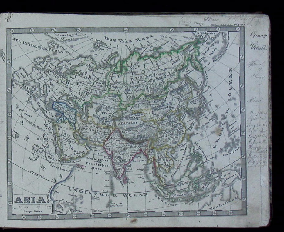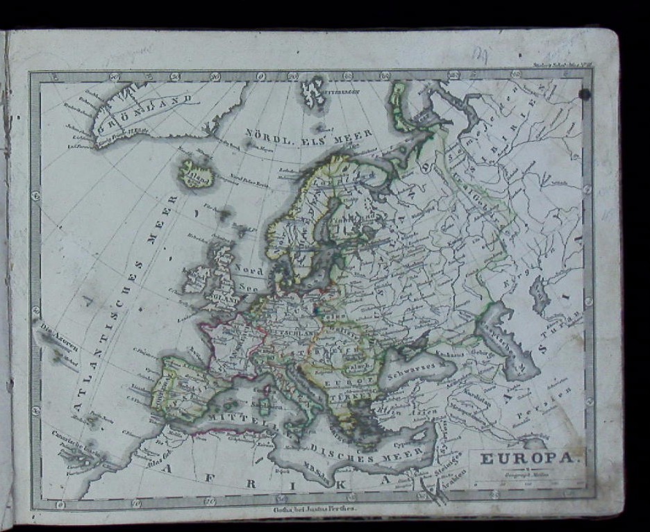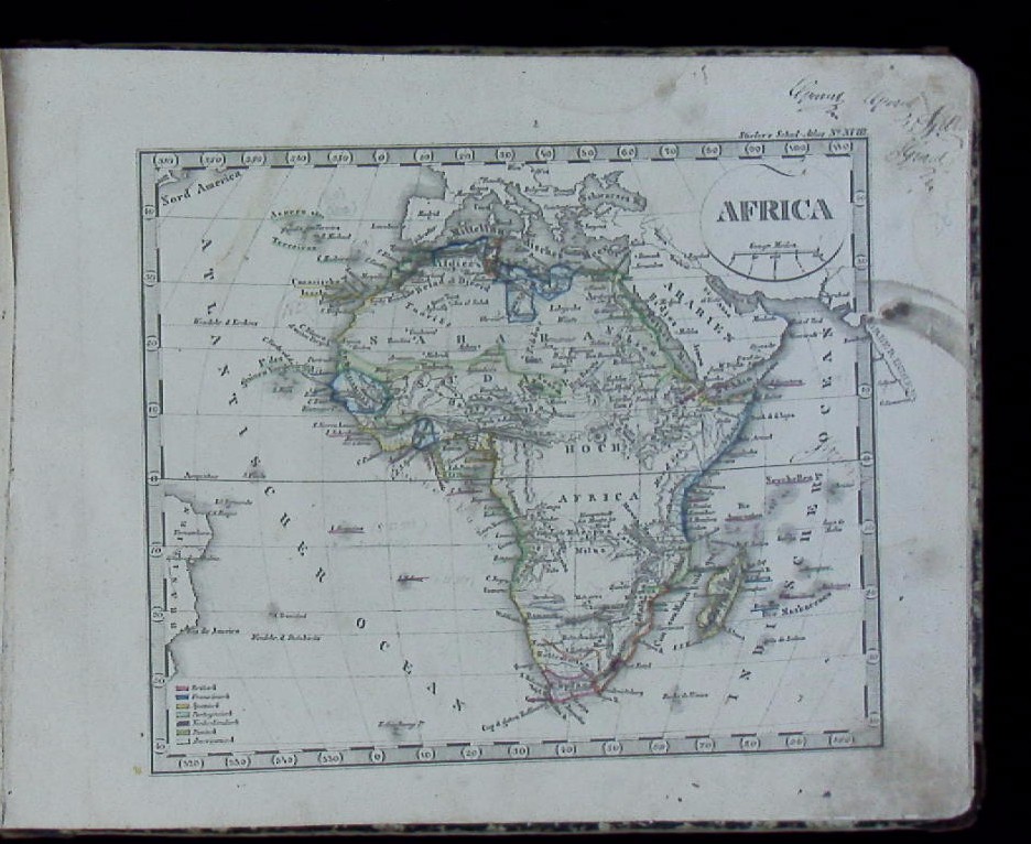 ATLANTEN.– SCHUL-ATLAS.– Über Alle Theile Der Erde Nach Dem Neuesten Zustande und Über Das Weltgebäude. Nach Stieler’s Hand-Atlas verkleinert. 29. verb. und verm. Aufl. Gotha (Justus Perthes), 1849. Quer 4°. 29 Bl. mit 28 grenzkolorierten Karten (so komplett). Hldr der Zeit. Rücken fast komplett abgeplatzt, Gelenke gelockert, innen teils an den Rändern hinterlegt, fingerspurig mit einigen Randmarginalien, insgesamt trotz der starken Gebrauchsspuren noch interessant. recht seltene Ausgabe.