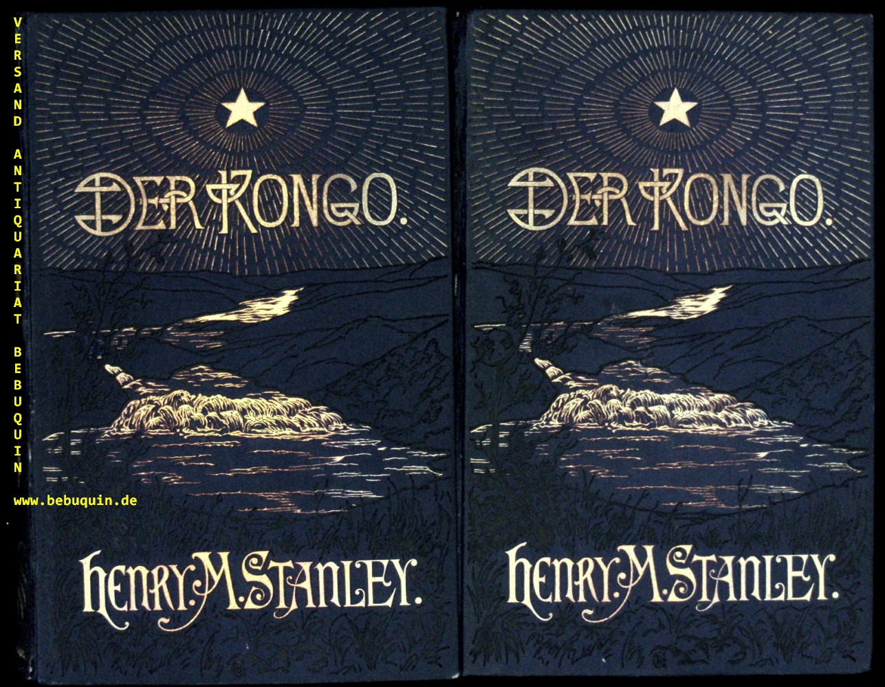 AFRIKA.– STANLEY, Henry Morton: Der Kongo und die Gründung des Kongostaates. Arbeit und Forschung. D.v. H. von Wobeser. 2 Bände. Leipzig (Brockhaus), (1885). XXXVIII, 557, XII, 516 S. mit über 100 Abbildungen, 2 grossen und mehrern kleineren Karten sowie 2 separaten Faltkarten in der Beilage. OLn mit reicher Schwarz- und Goldprägung. annähernd tadelloses Ex. dt. EA.