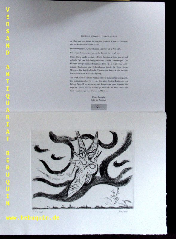 SEEWALD, Richard: Stupor Mundi. 13 Allegorien zum Leben des Staufers Friedrich II. Memmingen (Dietrich), 1974. Quer Gr. 4°. 32 Bl. mit zahlr. Bildtafeln. ill. OKart. tadellos. Nr. 58 von 100 Ex. der Vorzugsausgabe mit einer nummerierten und vom Künstler eigenhändig signierten Original Radierung inliegend.