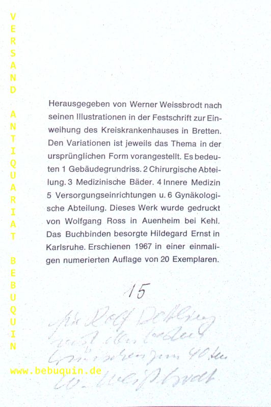 WEISSBRODT, Werner: (Hrsg.) Variationen. Auenheim (Ross), 1967. 4°. 24 Bl. mit 21 farb. Bildtafeln nach den Illustrationen von Werner Weißbrodt in der Festschrift zur Einweihung des Kreiskrankenhauses in Bretten. ill. OHLn von Hildegard Ernst. tadellos. Nr. 15 von 20 numerierten und mit einer eigenhändigen signierten Widmung Weissbrodts versehenen Ex. der einmaligen Ausgabe. Eine Rarität. Werner Weißbrodt wurde 1928 in Hockenheim geboren. Er studierte an der Freien Akademie Mannheim und an der Akademie der Bildenden Künste (ABK) Karlsruhe. Während seiner Studienzeit gewann er 1951 einen Plakatwettbewerb für die Olympischen Spiele in Helsinki und 1952 den Wettbewerb „Das internationale Plakat“ in Karlsruhe. Seine berufliche Laufbahn begann er beim Landesgewerbeamt Baden-Württemberg in Karlsruhe. Dort konzipierte er Ausstellungen und übernahm die Redaktion der Zeitschrift Werkkunst. Nach einem Lehrauftrag an der Karlsruher Akademie für bildende Künste und an der damaligen Pforzheimer Staatlichen Kunst- und Werkschule für Oberflächengestaltung Anfang der 1960er Jahre erhielt er 1973 eine Professur an der Fachhochschule für Gestaltung Pforzheim. (Wikipedia)
