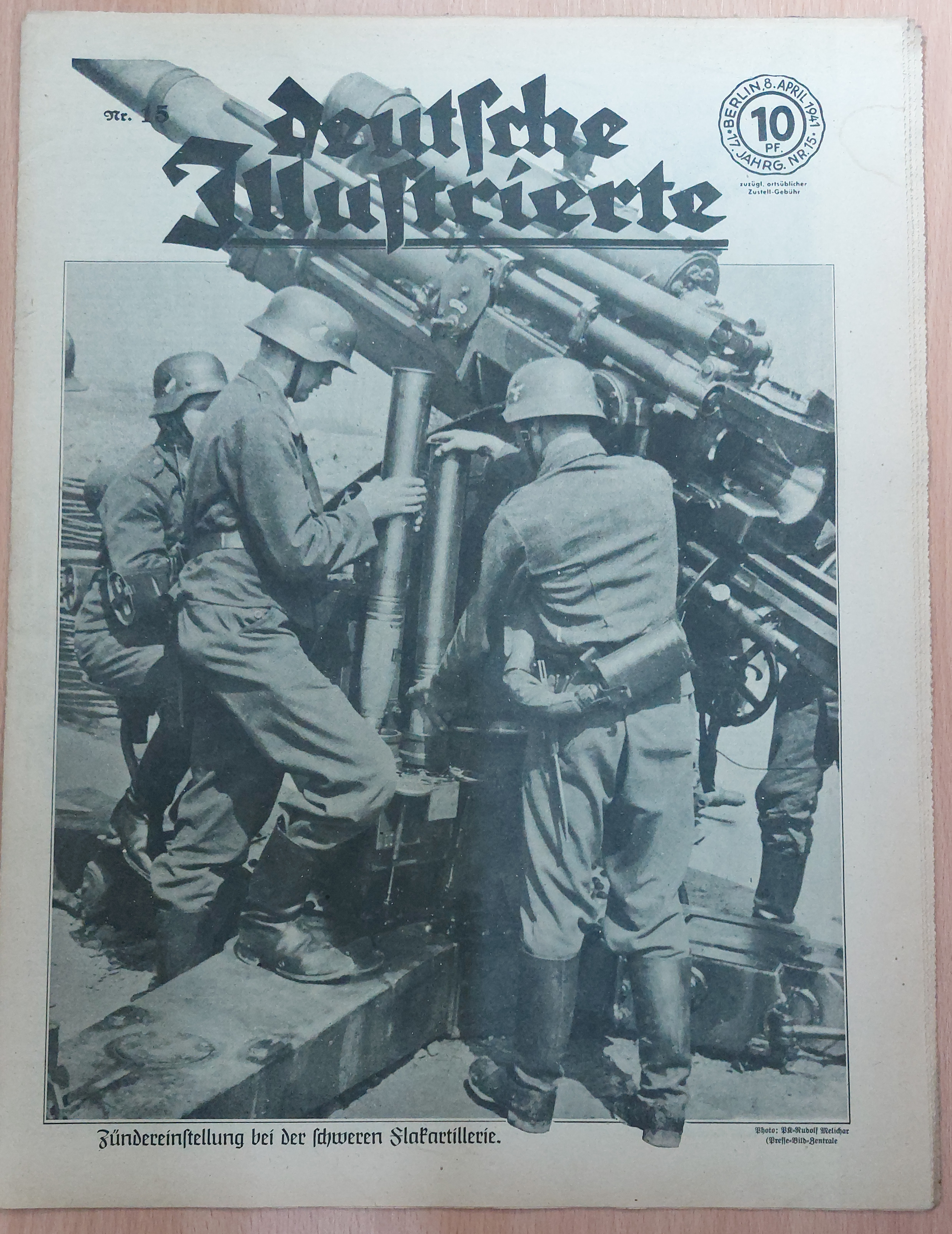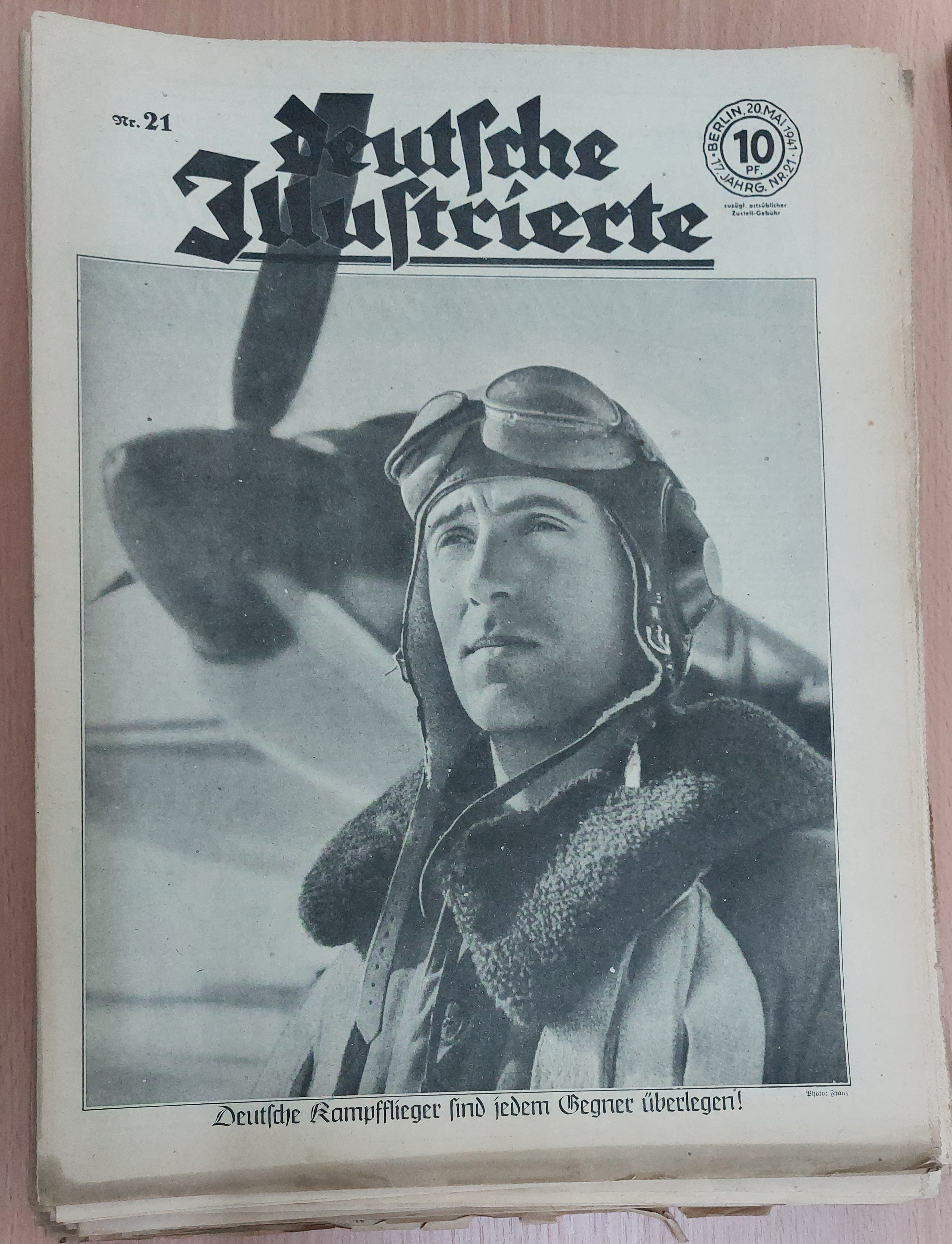 2. WELTKRIEG.– ZIMMERMANN, Richard: (Redaktion) Deutsche Illustrierte. 17. Jahrgang. 52 (von 53) Heften. Berlin (Erich Zander), 1941. 37 x 28 cm. über 1000 S. mit zahlr. zumeist fotografischen Bildern. ill. OBr. Kanten teils bestoßen, schattenrandig und gebräunt, vereinzelte Einrisse, es fehlt das Heft Nr. 1. Eindrucksvolles Dokument für Nationalsozialismus und 2. Weltkrieg. „Deutsche Illustrierte“ ist der Name einer Zeitschrift, die von 1928 bis 1944 in Deutschland erschienen ist. Es handelte sich um ein Magazin mit einem breiten Themenspektrum, das sowohl aktuelle politische und gesellschaftliche Ereignisse als auch kulturelle Inhalte und Unterhaltung umfasste. Die Zeitschrift war bekannt für ihre hochwertigen Illustrationen und Fotografien. (Wikipedia)