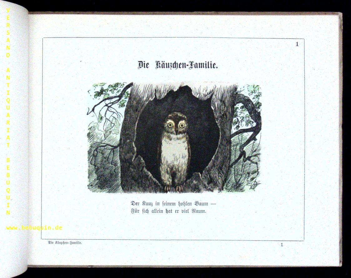 MÜNCHENER BILDERBÜCHER.– DIE KÄUZCHEN-FAMILIE.– Wie es wär, wenn’s anders wär! 2 lustige Geschichten für Kinder. München (Braun & Schneider), 1878. Quer Gr. 8°. 19 gez. Bl. farb. ill. OPb. leicht gebräunt. = Münchener Bilderbücher, Nr 1.