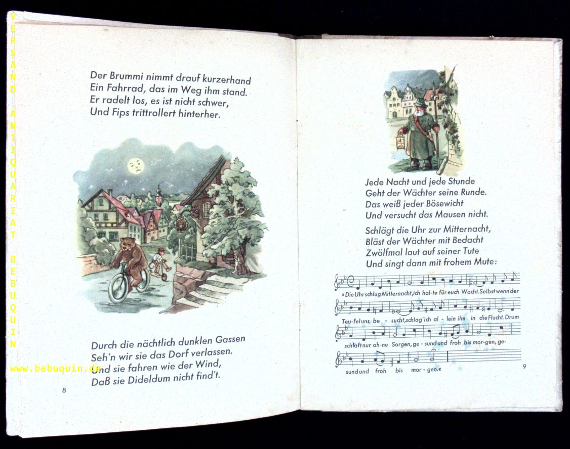 HAUENSTEIN, Arthur: Brummi-Brummi Tanzebär. Eine lustige Vagabundengeschichte. Altenburg (Hauenstein), 1947. Gr. 8. 20 S. mit farb. Bildern von Paul Bornschein. farb. ill. OHLn. leicht angeschmutzt. EA Mück 762.