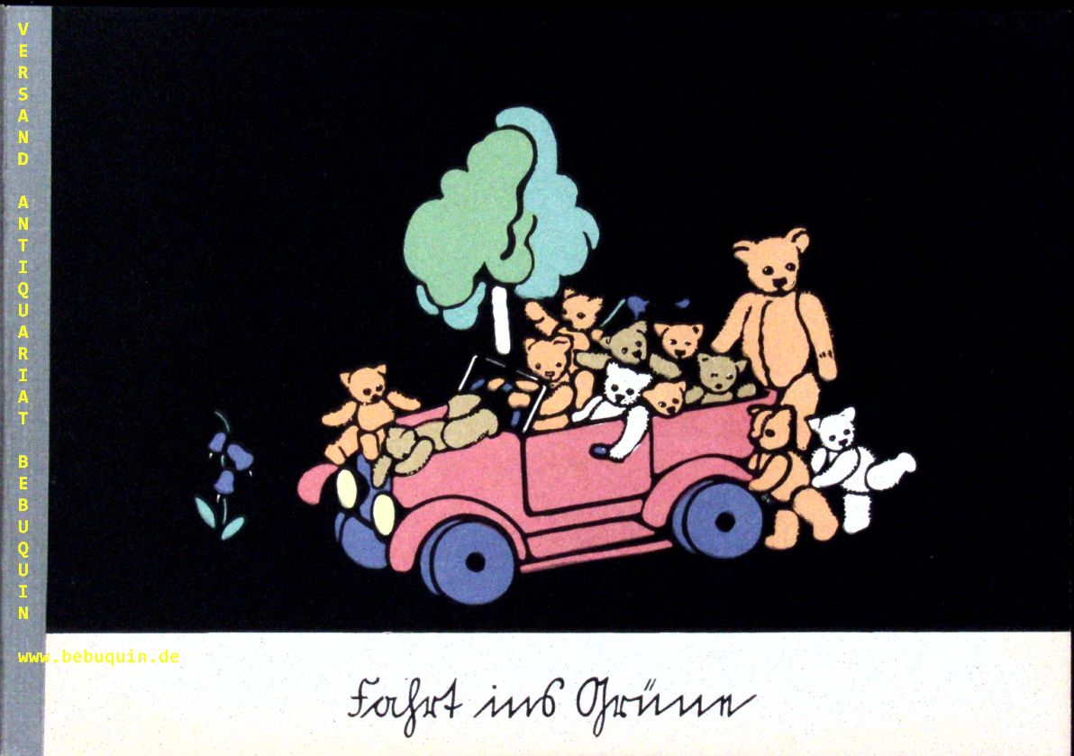 NEUGEBAUER, Marianne: Meine lieben, lieben Teddys. Das bunte Buch einer lustigen Bärenfamilie. Leipzig (Heling), ca 1947. Quer 4°. 8 Bl. unzerbrechliche Pappe mit farb. Bildern und Sütterlinschrift. farb. ill. OHLn mit leinenverstärkten Gelenken. sehr gut erhalten. sehr seltene Großvariante des gesuchten Bärenbuchs. (Mück 4208)