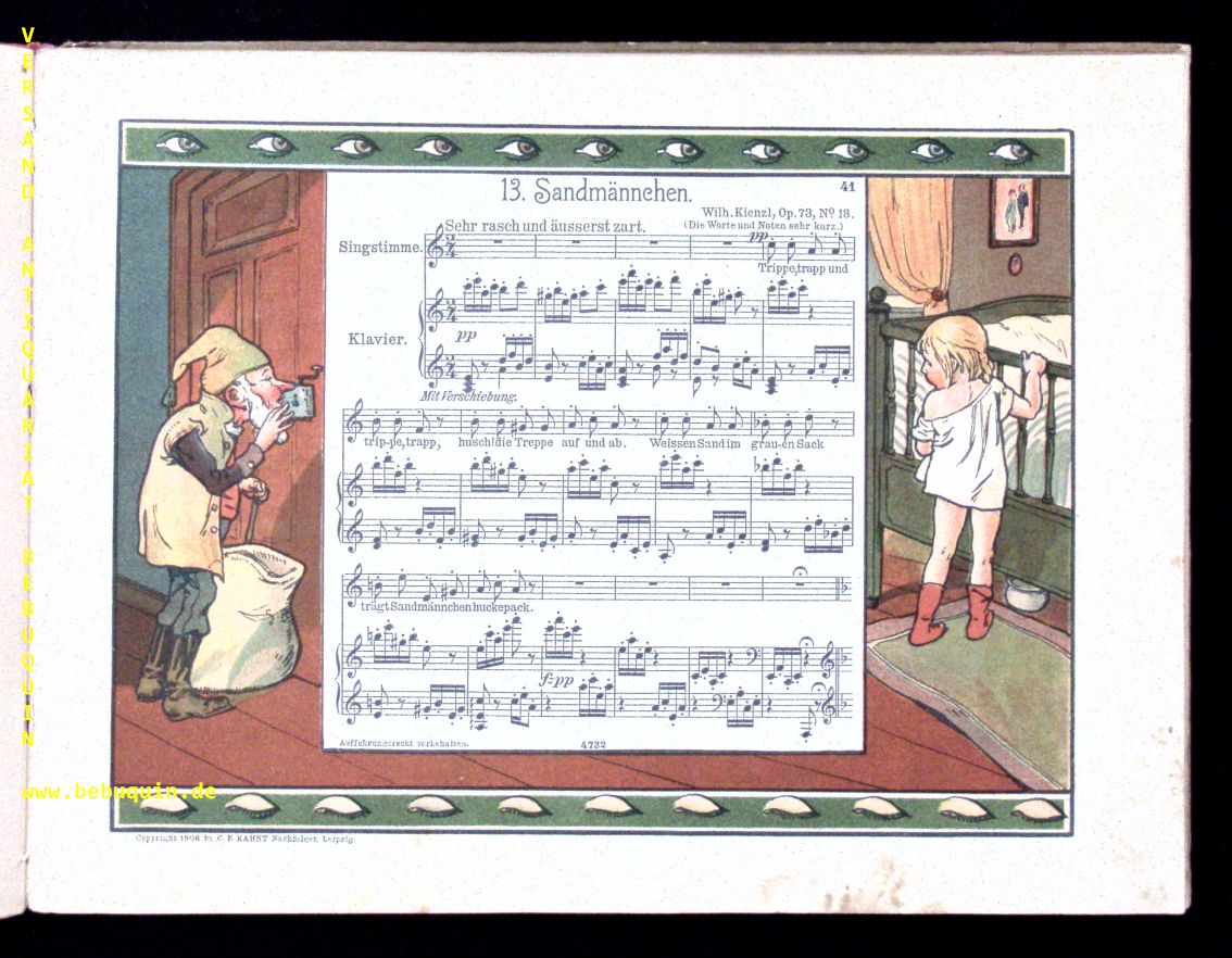 LIEDERBÜCHER.– KIENZL, Wilhelm: Aus Onkels Liedermappe. Zwanzig Lieder für junge und alte Kinder. Klavierpartituren. Leipzig (Kahnt Nachfolger), 1906. quer-octavo. 65 S. mit zahlr. farblithogr. Bildern und Bildtafeln eines P.Sch. sowie den Kindskopf-Vorsätzen. farb. ill. OHLn. teils gebräunt, teils fingerspurig, insgesamt denoch ein gutes Ex. EA mit dem Liederheft von F.F. Fischenschlager inliegend: 60 Kinderlieder für Jung und Alt mit Bildern von Fritz Silberbauer. Quer Gr. 4°. 27 S. OBr.