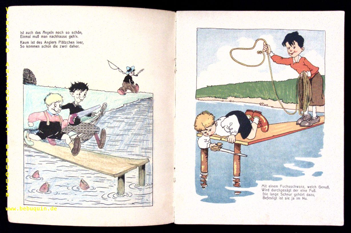 STRUWWELPETER.– DENNER, Arthur: (Hier als Arden Turner) Böse Bubenstreiche in Reimen und Bildern. Fürth (Schwager & Steinlein), ca 1935. 4°. 10 Bl. mit teils farb. Bildern von Curt Junghändel. farb. ill. OKart. die ersten s/w Zeichnungen wurden ausgemalt, sonst gutes Ex. „Früheste bisher bekante Gesamtausgabe dieses Titels.“ Hier mit dem Einband, auf dem der Angler bereits ins Wasser fällt. Von größter Seltenheit! Rühle 1736.
