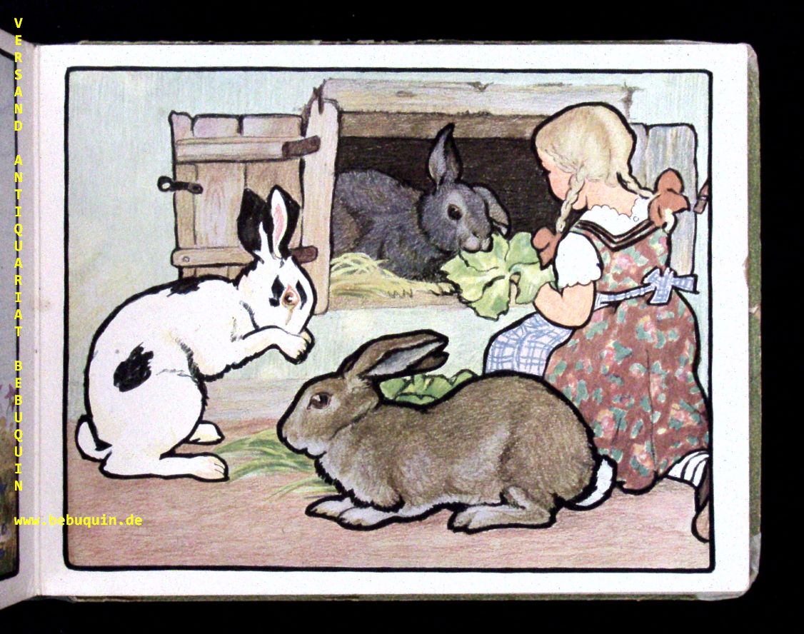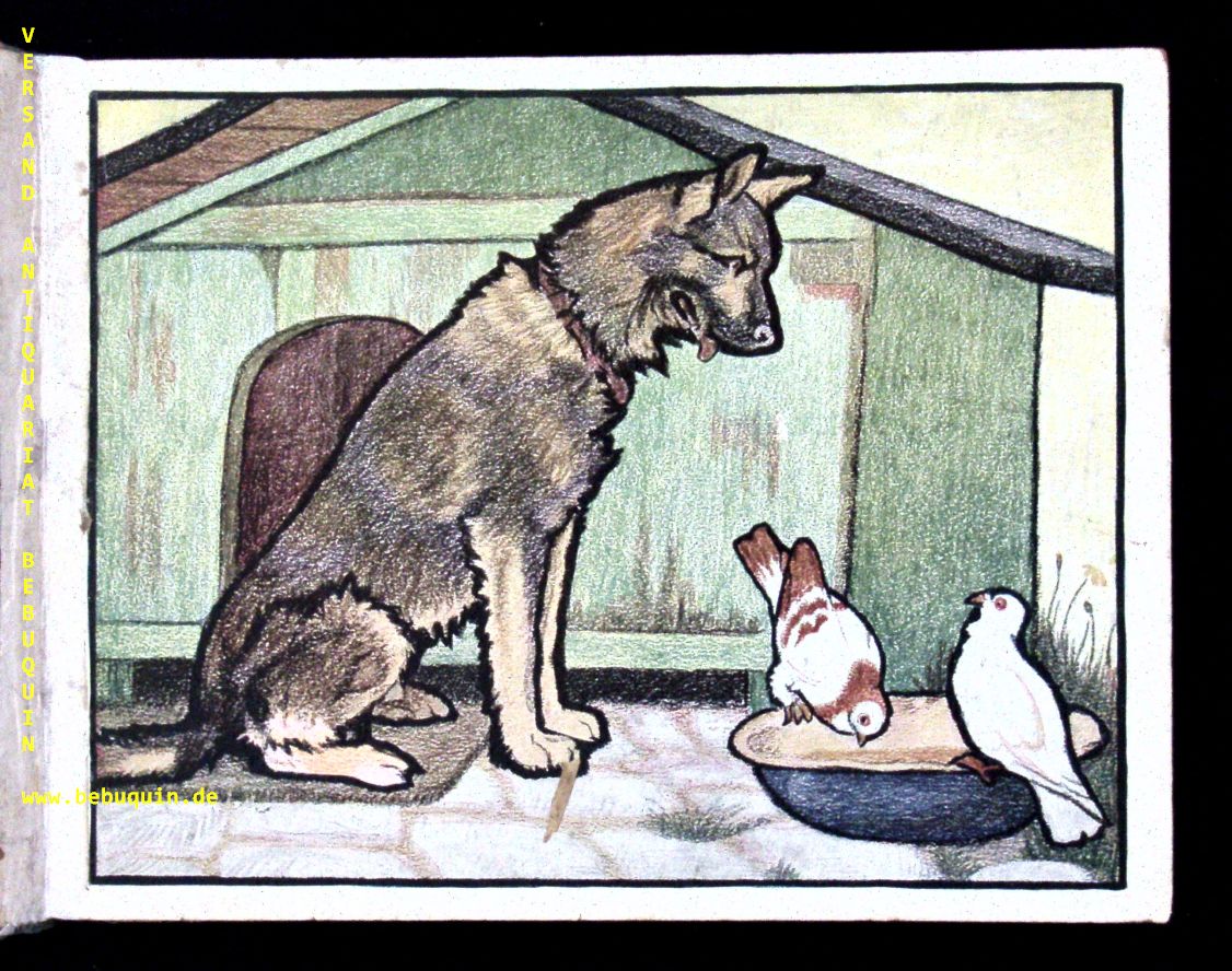 CASPARI, Gertrud: Tierbilderbuch. 11./12. Auflage. Leipzig (Hahn), 1944. Quer 4°. 6 unpag. Pappbl. mit farb. Bildern von Gertrud Caspari. farb. ill. OHLn. Kanten etwas berieben, leicht bespielt. letzte Auflage des oft nicht nachweisbaren Titels mit den eidrucksvolen Motiven. Neubert