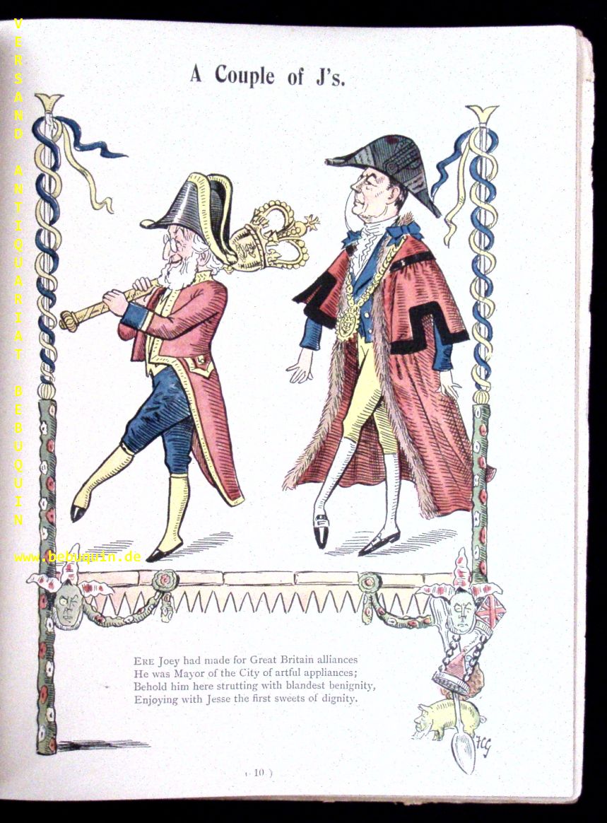 STRUWWELPETER.– BEGBIE, Harold: The Struwwelpeter Alphabet. London (Grant Richards), (1900). 4°. 27 Bl. mit 27 farb. Bildtafeln von F. Carruthers Gould. farb. ill. OHLn. Einband gebräunt, Gelenke gelockert, fliegender Vorsatz mit Vortitel fehlt, sonst gut. Seltene EA dieser Struwwelpeter Parodie in der 26 bekannte Gestalter der ganzen Welt in der Reihenfolge des Alphabets dargestellt werden. Rühle 1231.