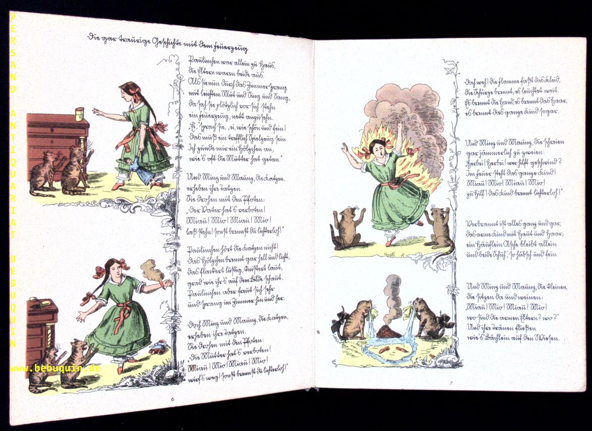 STRUWWELPETER.– HOFFMANN, Heinrich: Der Struwwelpeter. Lustige Geschichten und drollige Bilder. Ausgabe mit den alten Bildern und Sütterlinschrift. Mainz (Scholz), (1940). 4°., 24 S. mit farb. Illustr. des Autors. farb. ill. OHLn. Einband etwas berieben, Stempel auf Innendeckel, sonst feines Ex. Unzerreißbare Ausgabe Nr. 5098. Rühle 41a.