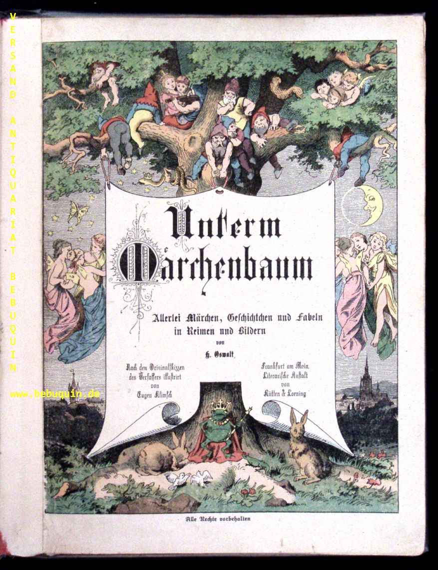 KLIMSCH.– OSWALT, Heinrich: Unterm Märchenbaum. Allerlei Märchen, Geschichtchen und Fabeln in Reimen und Bildern. 11. Aufl. Frankfurt am Main, Rütten & Loening, (1921). 4°. 32 S. mit zahlr. farb. Bildern von Eugen Klimsch. farb. ill. OHLn. Gelenke stabilisiert, einige Blattränder hinterlegt, insgesamt gut erhalten. Schug Kinderwelt 419, Klotz 5247/2.