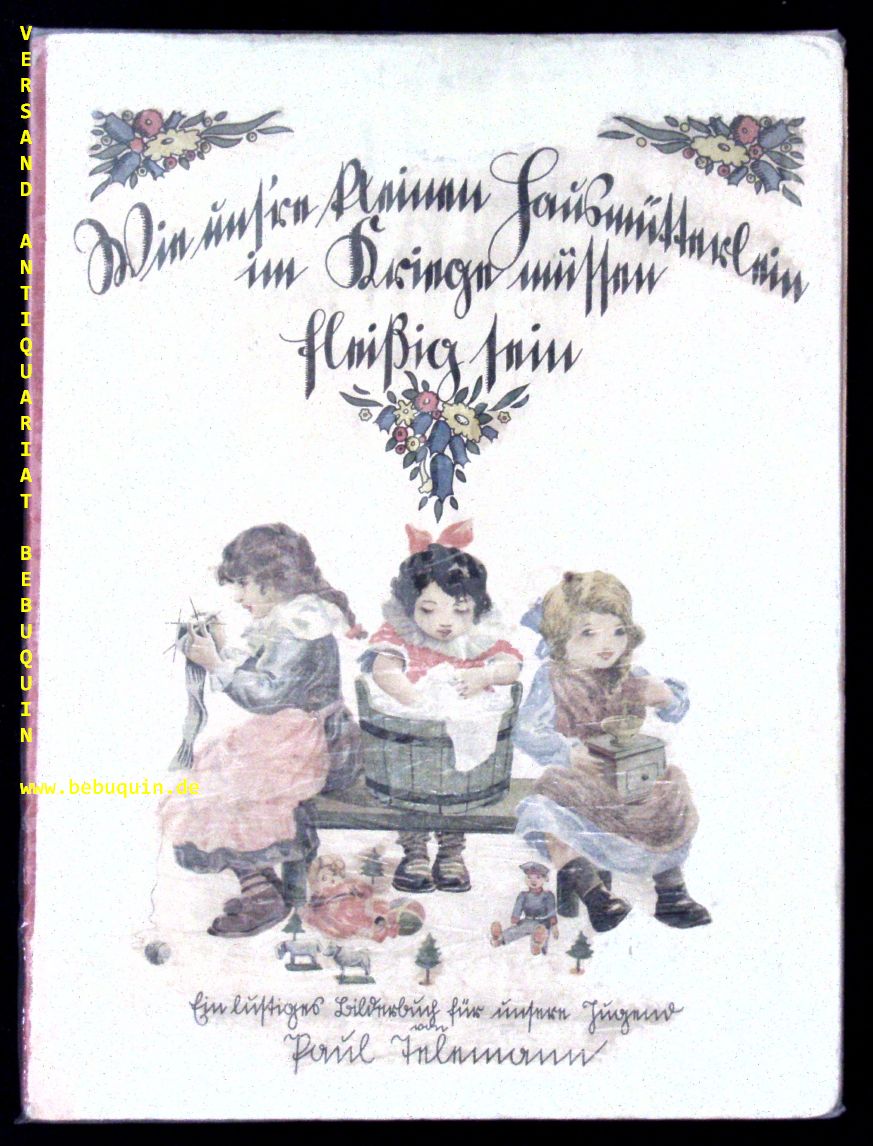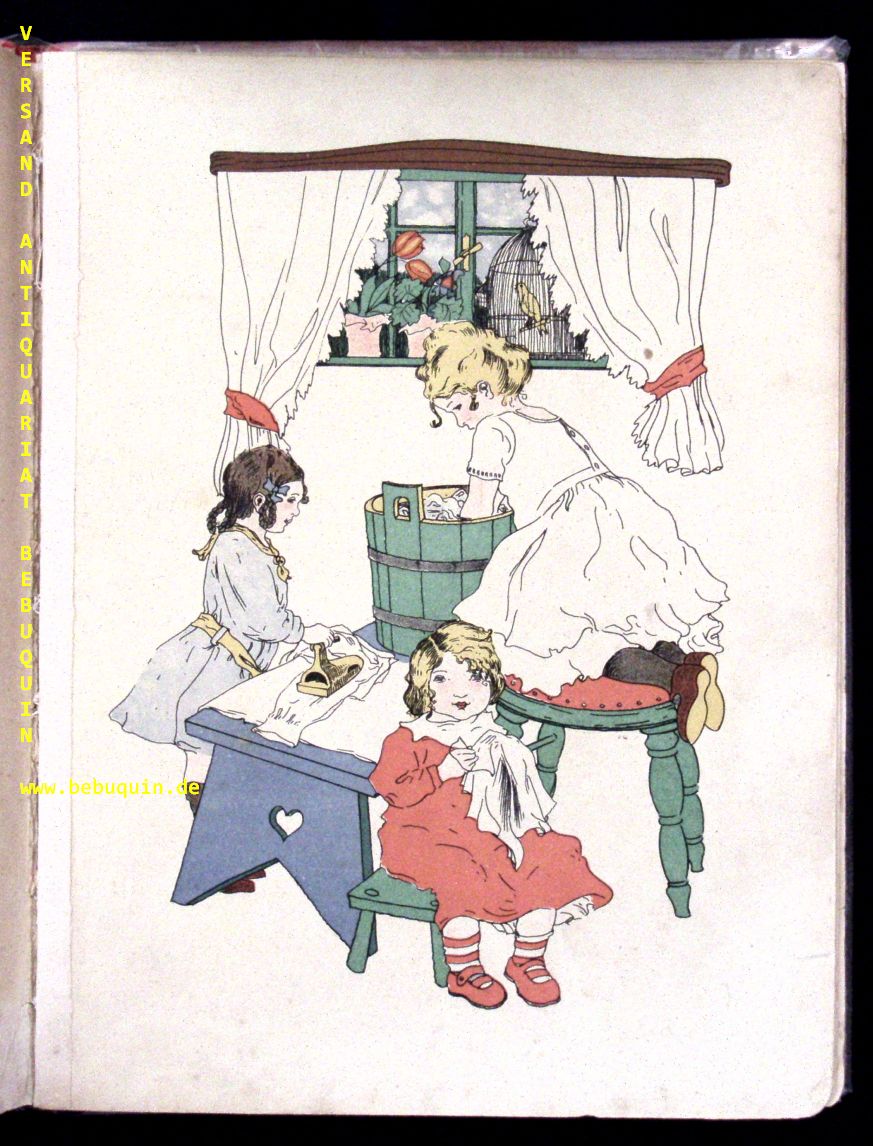 TELEMANN, Paul: Wie uns’re kleinen Hausmütterlein im Kriege müssen fleissig sein. Ein lustiges Bilderbuch für unsere Jugend. Berlin-Charlottenburg (Michel), 1915. Gr. 4°. 8 Bl. mit zahlr. farb. Illustrationen. farb. ill. OHLn. Gelenke sauber stabilisiert, wenige Randläsuren hinterlegt, insgesamt noch gut. Seltene EA dieses eindrucksvollen Kriegsbilderbuchs.