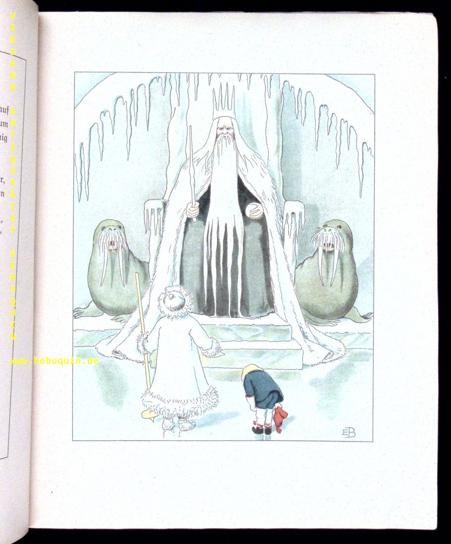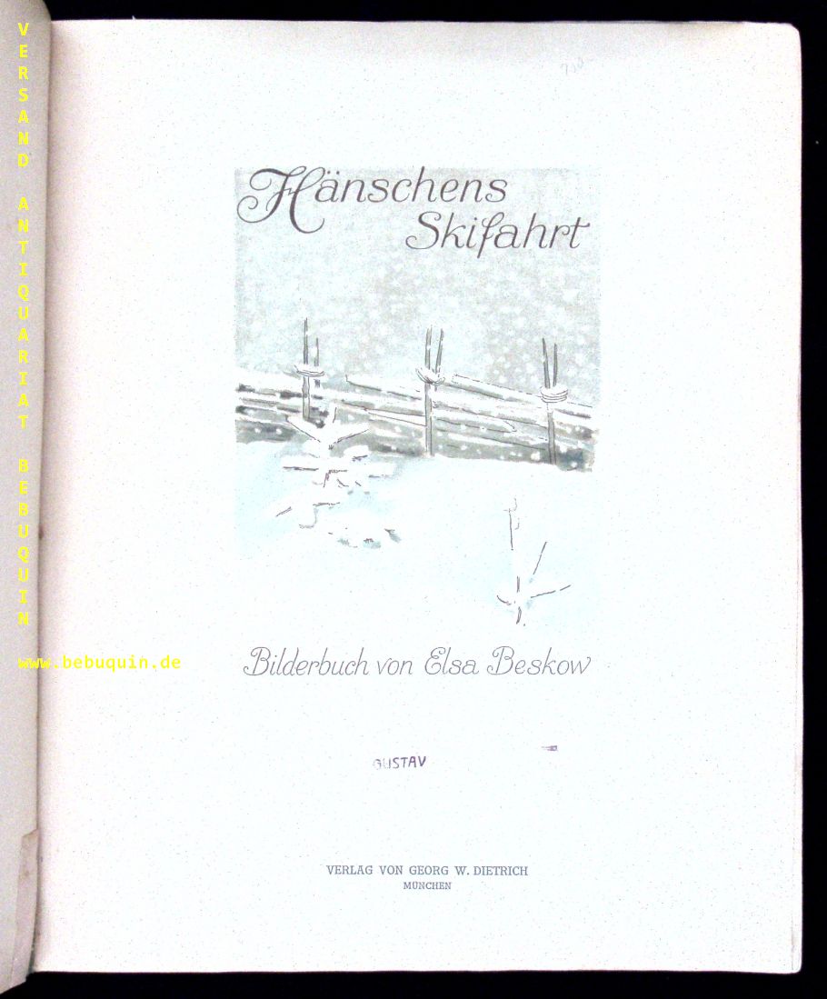 BESKOW, Elsa: Hänschens Skifahrt. Bilderbuch. München (Dietrich), (1908). 31 x 25 cm. 15 Bl. mit zahl. Textabb. + 15 (davon 13 ganzseitigen) farblithogr. Bildern. farb. ill. OHLn. teils etwas angeschmutzt und am letzten Blatt randverstärkt, insgesamt aber sehr ordentlich bis gut. seltene dt. EA. Schug 2828; Ries 3; laut Thomi: „Es dürfte sich um die wahre erste deutsche Auflage dieses Titels handeln, gegenüber der üblicherweise im Handel anzutreffenden etwas kleineren Ausgabe (21 x 29 cm). Hier ist die Verlagsangabe auf dem Einband in kursiver Schrift, die Vorsätze sind illustriert, die S/W-Zeichnungen sind teilweise leicht abweichend, Schrift und Bild sind hier etwas feiner gedruckt.“
