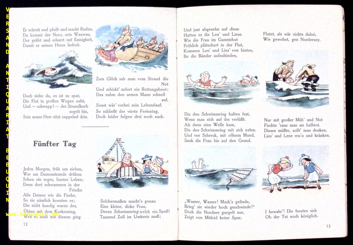 STRUWWELPETER.– LEVETZOW, Hulda von: Lies und Lene. Das bekannte Schwesternpaar. Eine Buschiade für groß und klein in sieben Streichen. o.O. (Pestalozzi), ca 1950. Gr. 8°. 20Bl. mit zahlr. farb. Illustrationen von Otto Waffenschmied. farb. ill. OKart. leicht angeschmutzt und bestoßen. = Verlagsnummer S5. wohl die 1. Aufl. dieser neu illustriertem Ausgabe.