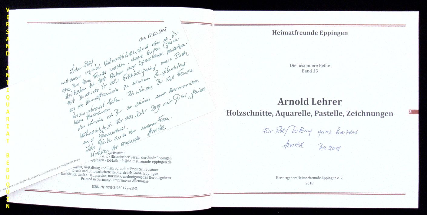 LEHRER, Arnold: Holzschnitte, Aquarelle, Pastelle, Zeichnungen. Eppingen (Heimatfreunde Eppingen), 2018. Quer Gr. 8°. 120 S. mit zahlör. farb. Bildataeln. ill. OKart. tadellos. = Die besondere Reihe / Band 13. EA mit einer eigenhändigen persönlichen Widmung auf Titelseite und einem sehr persönlichen Brief inliegend.